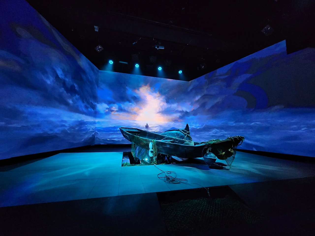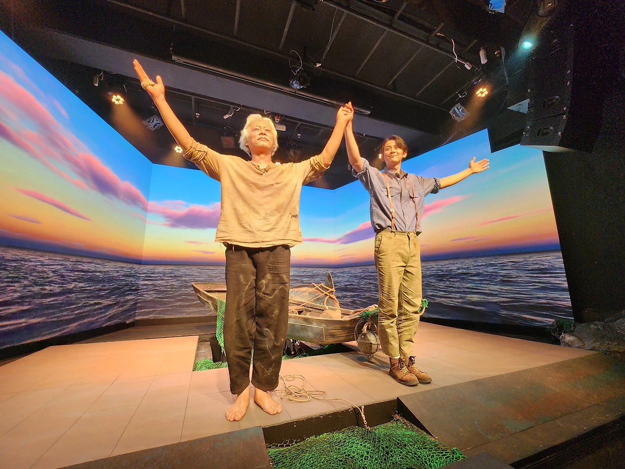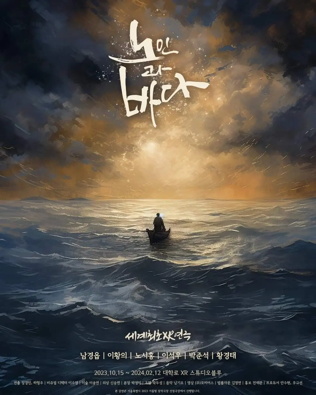 헤밍웨이 원작의 소설을 연극으로 각색한 무대. 산티아고 노인과 소년, 2명의 배우가 등장하는데 소년은 노인의 상황을 설명하기도하고, 노인과 대화하기도 하면서 무대와 객석을 연결하는 해설자의 역할을 한다. 극장에 들어가면 크지않은 자그마한 배 한 척이 중앙에 놓여있는 게 무대의 전부다. 그런데 연극이 시작되자마자 무대뒤의 배경막에 광대한 카리브해가 매혹적으로 펼쳐지는데... 소위 '세계 최초의 XR(eXtended Reality: 확장현실)연극'! 배경막은 바다의 낮과밤, 무수한 별들, 무심한 보름달을 보여주다 어느 순간에 돌고래와 청새치, 상어들의 무대가 된다. 무대에서 디지털기술로 한바다의 리얼리티를 이정도로 구현한 것만으로도 연극은 70분간의 충분한 볼거리가 되었다. 그리고 많은 경우 자연과 소통하고 교감하지만, 자연이 부여한 역경에는 절대로 굴하거나 좌절하지 않는 노인의 단단한 의지와 철학도 감동적이었다. 책으로 읽을 때 잘 와닿지 않았던 부분이 이런 거였구나! 멀티 캐스팅인데 내가 본 회차에서는 이황의, 황경태 배우의 조합이었다. 땀 범벅이 되어가며 혼자서 줄곧 무대를 장악하여 최고의 연기를 보여준 두 배우에게도 큰 박수를!! 몇 십초면 두 시간 짜리 영화 한 편을 다운로드 할 수 있는 이 편리한 시대에 디지털 기술과 아날로그 연극이 어떻게 행복하게 공존할 수 있는지를 보여준 좋은 무대였다.