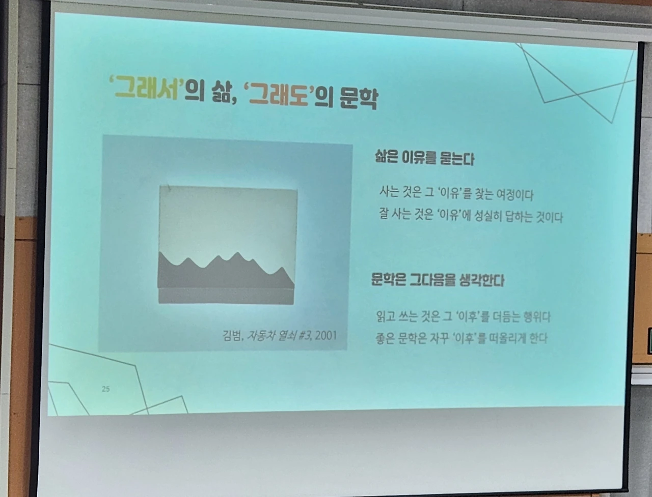 장난꾸러기 소년의 순수한 느낌을 아직도 간직한 40대의 시인은 시를 쓴다는 것은 다른 사람이나 사물이 되어보는 것이라고 자신의 시론을 펼치며, '그래도'의 문학에 대해 아이들 눈높이에서 쉽고 재미있게 이야기를 이어나갔다. 평소라면 잘 안읽었을 시들을 몇 편 읽었는데 그 중의 한 편! (창비에서 청소년 시선집을 따로 내는구나!!!)