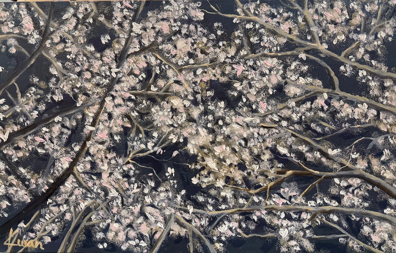 (Acrylic and oil on canvas) 밤벚꽃... 지난 봄밤에 벚꽃 터널을 지나다 올려다본 하늘을 찍어둔 사진을 그렸다. 모네 풍으로 희미한 형태로 그냥 끝내려 했는데 묘사를 더 해야한다는 선생님의 조언으로 섬세한 꽃잎과 나무의 음영이 추가되어 예상보다 시간이 제법 걸린... 역시 전문가의 조언과 도움은 그림의 완성도와 정비례하는 듯... ^^
