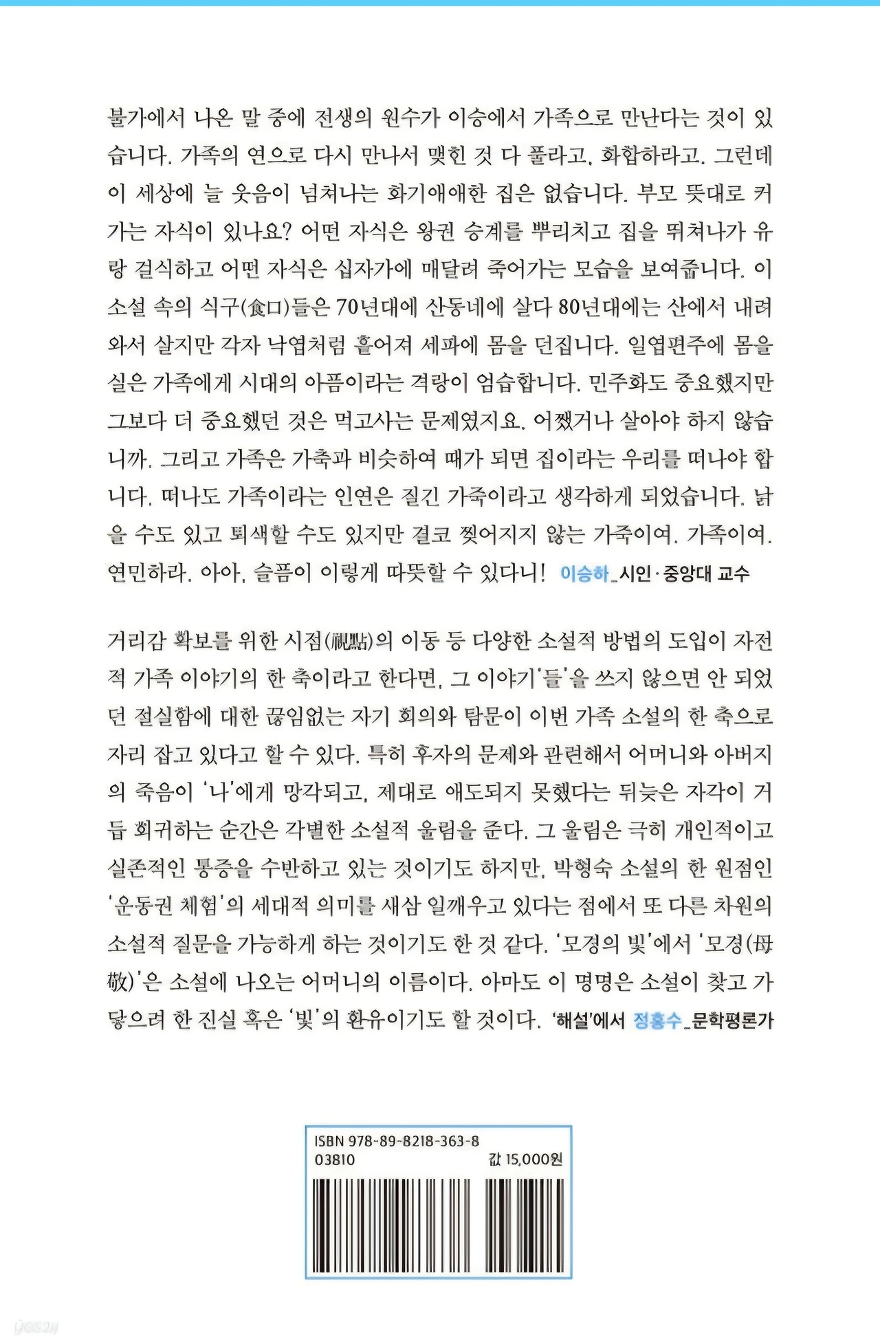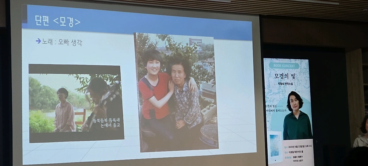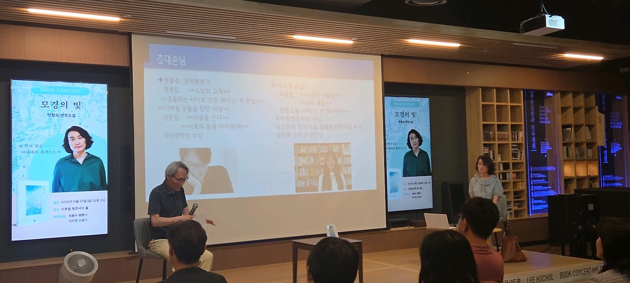 울림이 컸던 책을 읽고 그 책의 저자를 직접 만나 작품 얘기를 들을 수 있다는 것은 독자에게는 하나의 축복일 것이다. '모경의 빛'의 작가 박형숙 북콘서트에 다녀왔다. 책에 해설을 쓰신 평론가와 동료 소설가의 애틋한 축사에 이어, 작가는 자신의 작품에 언급되었거나 배경이 되었던 시와 그림, 연극, 음악 등을 사진과 화면, 동영상으로 하나씩 소개했다. 겸손하고 조심스럽지만 단단한 목소리로... 연극 레드, 마크 로스코의 그림, 백석과 박인환의 시, 노고지리와 이상은, 윤선애, 킹 그림슨의 노래, 명동성당, 그리고 사진, 사진들... 40년도 더 묵은 각자의 추억들이 소환되면서 객석은 한 순간 경건하고 먹먹해졌다. 이 여름, 급변하는 정세와 사회 속에서 가족과 나를 돌아볼 수 있고, 오래 여운이 남을 소설을 찾고 계신다면 꼭 읽어 보시길...