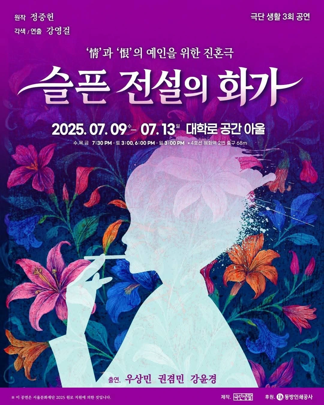 한국인이라면 한 번은 본 적이 있을 꽃과 뱀의 화가 천경자의 삶을 다룬 연극을 폭염을 뚫고 보고 왔다. 연극은 한 기자의 눈을 통해 일제 강점기 때의 동경유학에서 시작해서 한국의 현대사 전체에 걸쳐, 화가이자 수필가였던 그녀의 삶 전반을 다루고 있다. '여류화가'로서 당대에는 파격적이었을 청뱀을 그리게 된 이야기며 두 번의 결혼 이야기, 말년의 해외 스케치 여행 등이 소개되는데, 파격적인 것은 이 모든 이야기들을 마당극 형식을 빌어 단 세명의 배우들이 전달한다는 것이었다. 차칫 단조로울 수 있었을 무대를 커버할 만큼 세 배우들의 역량은 출중했다. (화가 천경자를 연기하신 분은 어딘가 낯익다 했더니 뮤지컬 초창기 시절 '넌센스'에서 원장수녀역을 하셨던 바로 그 분!!!) 70년대로서는 파격적이었을 여자 혼자 떠난 6개월 간의 해외스케치 여행에서 그려진 수많은 이국적인 그림들을 배우들의 대사 뿐만 아니라 시원스러운 배경그림으로 왜 보여주지 않을까 궁금했는데, 저작권과 관련된 복잡한 법적 문제들이 얽혀있다고... 7/19일까지 대학로 공간아울