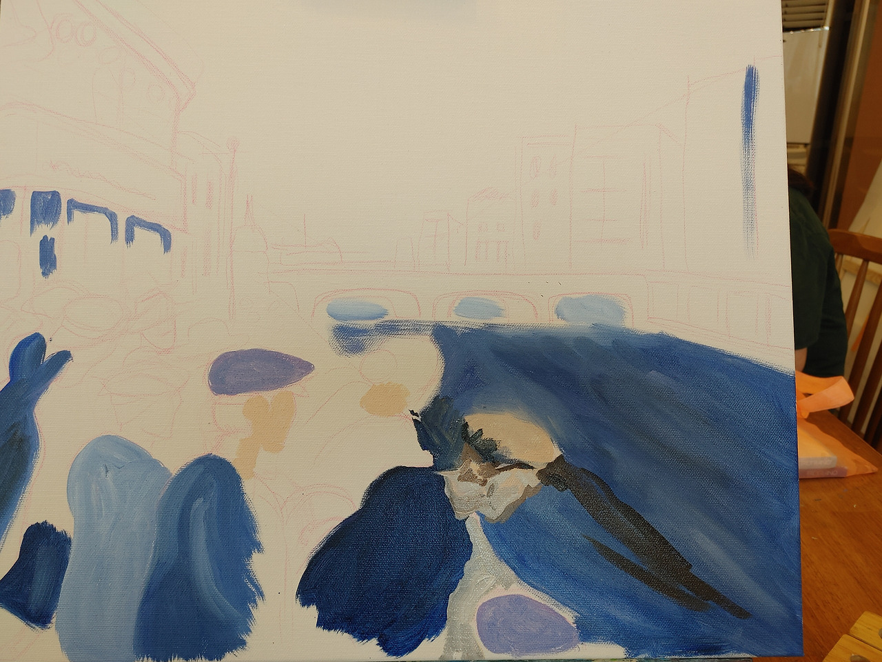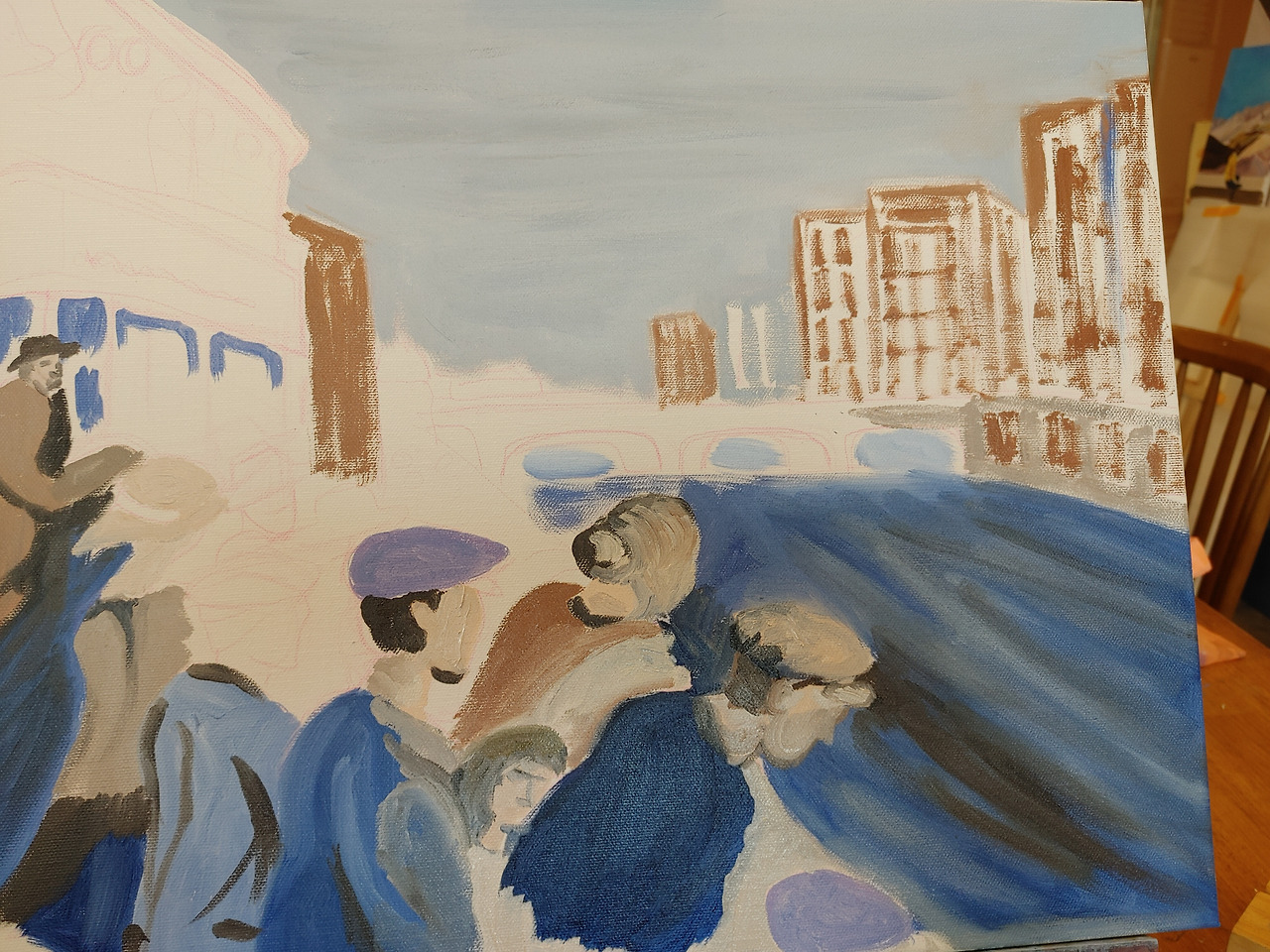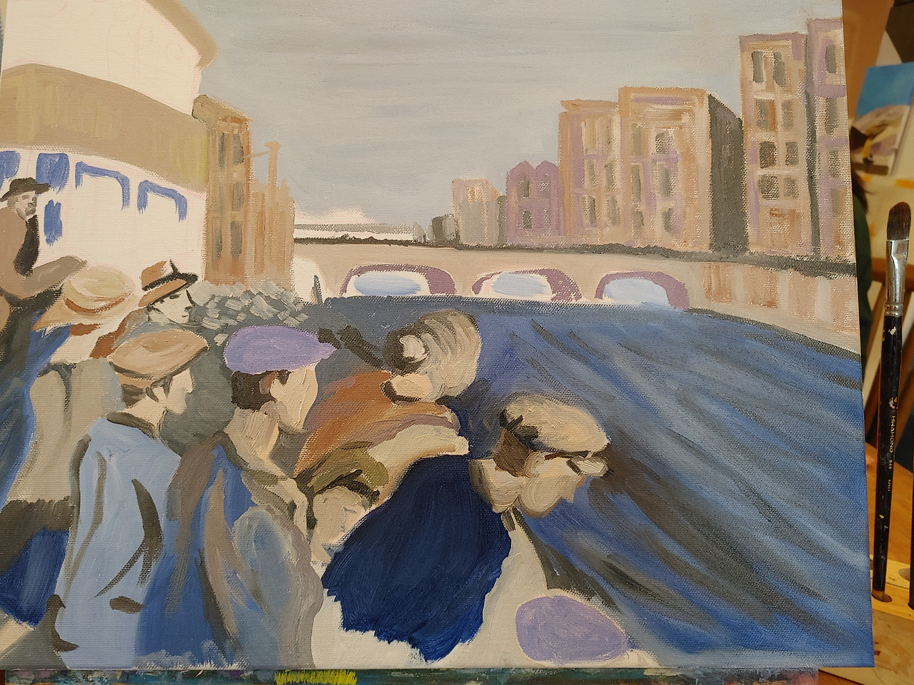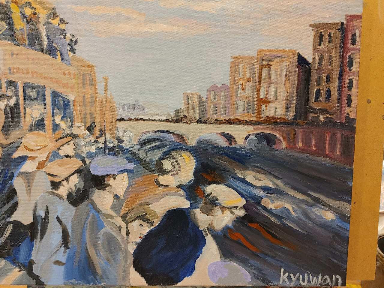 연습12... 게으름을 피우다가 한 달이 넘어 완성한 그림이다. 이 그림은 아일랜드의 시인 W.B. 예이츠의 동생인 Jack B.예이츠의 '리피강의 수영'(The Liffey Swim, 1923)이라는 작품을 보고 그린 것인데 아일랜드에서는 모르는 사람들이 없을 정도로 유명한 그림이란다. 한 페친분의 추천으로 그리게 됐는데, 더블린을 가로지르는 리피강에서 매년 열리는 수영대회와 강 양쪽으로 늘어선 수많은 구경꾼들을 묘사하고 있다. 우중충하게 흐린 하늘과, 무채색의 건물과 사람들 등 내가 짧은 기간 방문했었던 더블린의 느낌을 잘 표현했다. 애초에 가로로 더 긴 그림을 캔버스에 맞추느라 건물을 좀 잘라냈다. ^^; 인상주의풍으로 형태가 뭉개진 듯 하지만 자세히 들여다 보면 살아있기도 해서 세부묘사가 제법 힘들어 선생님의 도움을 살짝 받음! 여지껏 그린 그림 중 가장 어려운 작품이었지 싶다.