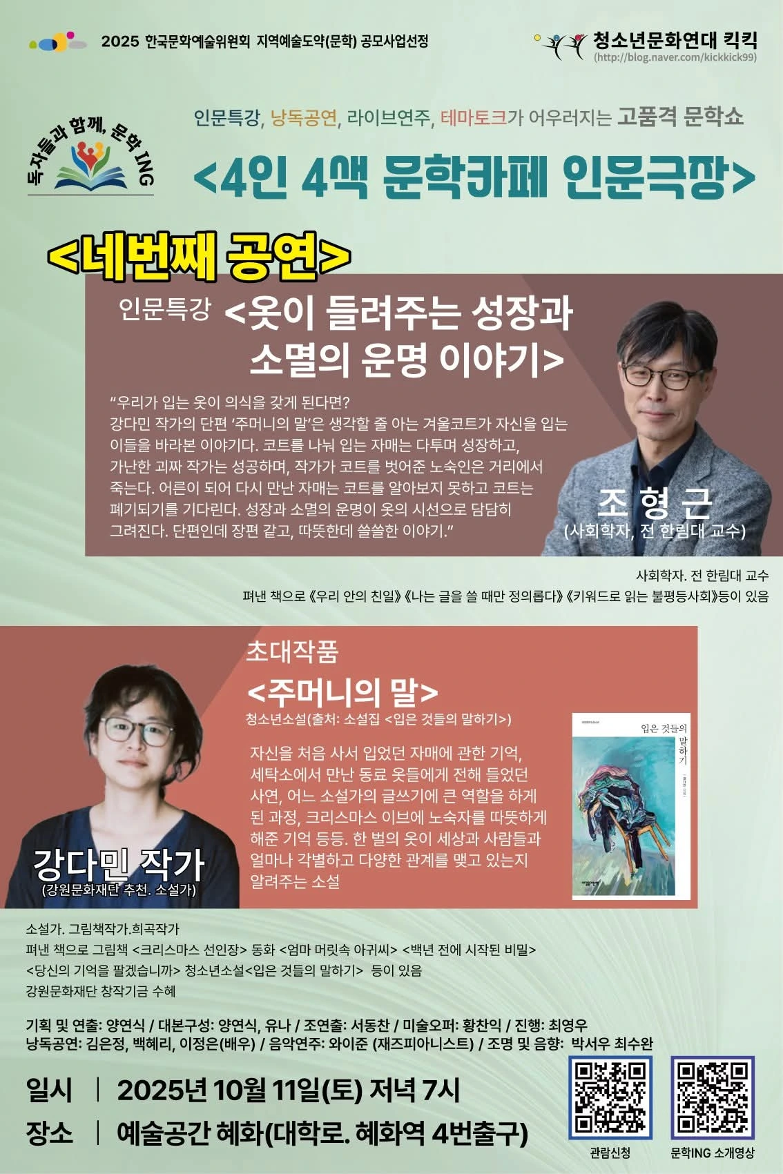 의미있는 이야기를 쉽고 재미있는 책으로 엮어 내시는 조형근선생님이 대학로 무대에 서신대서 내용도 자세히 안보고(!) 신청해서 다녀왔다. 빨리 소비하고 빨리 버리는 '패스트 패션'시대에 회색 코트 한 벌의 일생을 따라가는 강다민작가의 청소년소설을 배우들의 낭독극으로 듣고, 선생님의 강연을 듣는 순서로 이어졌는데 예상보다 훨씬 좋았다. 심플한 키보드 반주 하나와 간단한 소품, 사람의 목소리만으로도 우리사회의 문제를 진지하게 되돌아보게 만드는 따뜻하고 훈훈한 시간... 작고 소박하지만 진정성 있는 이런 공연들이 시민들의 집 가까운 곳에서 더 자주 열리면 좋겠다. ^^