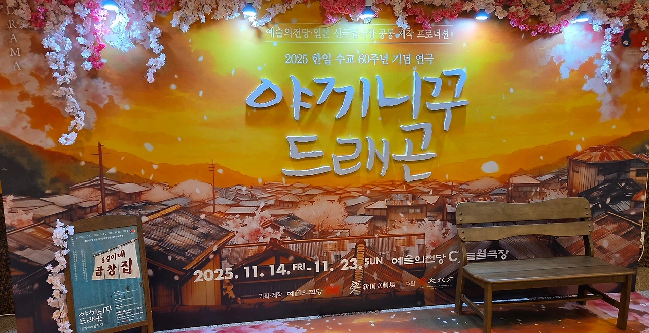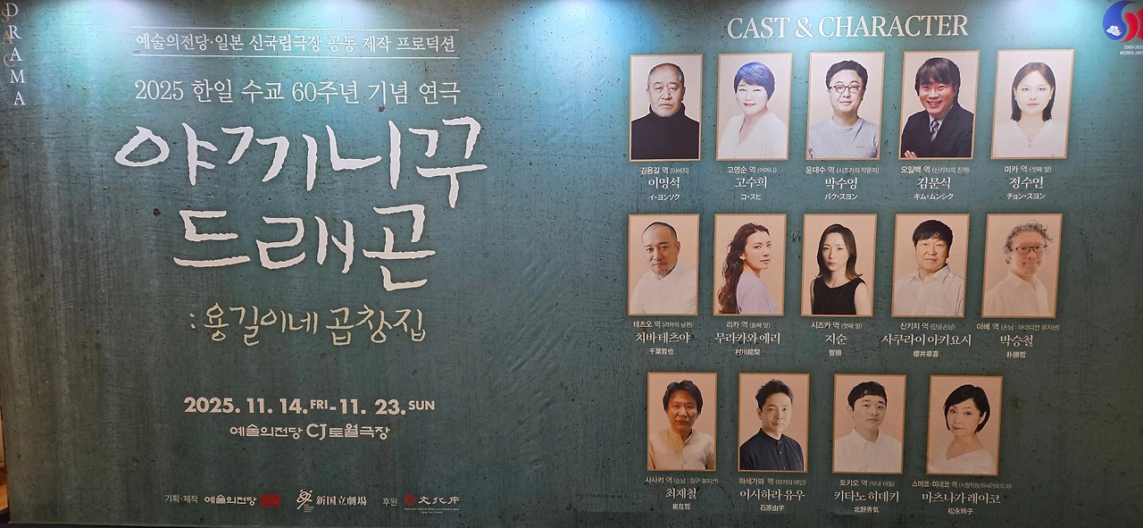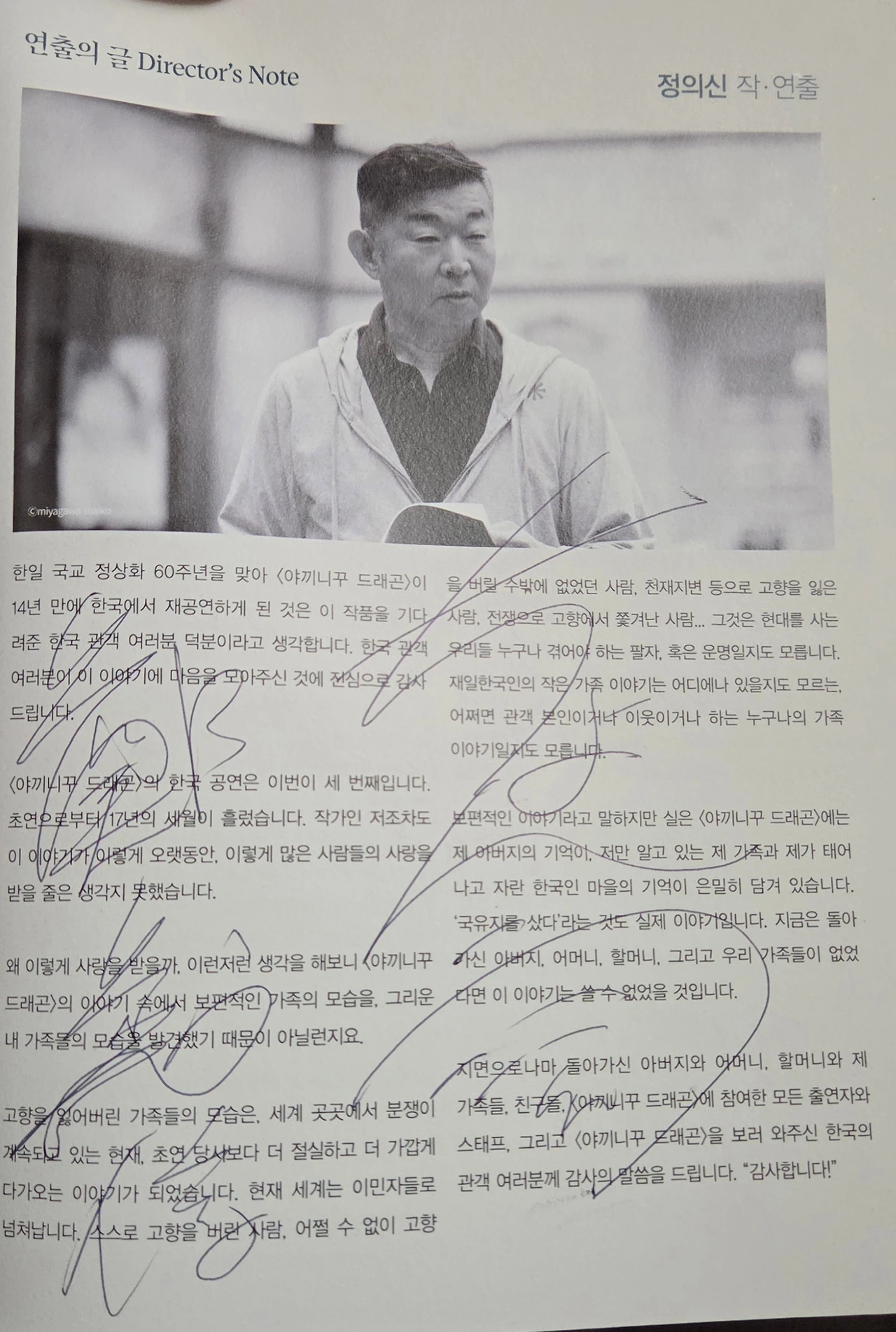 한일수교 60주년을 기념하는 연극 '야끼니꾸 드래곤(용길이네 곱창집)'의 막이 올랐다. 한국에서는 14년 만에 하는 세번째 공연이라고 한다. 이미 작가가 감독한 동명의 영화를 본적이 있어 대강의 줄거리는 안다고 생각했는데, 영화는 영화이고 연극은 연극이었다. 일본이 급속히 경제발전을 이루던 70년대 초반, 발전이 비껴간 듯한 간사이 지역 한 비행장 근처의 허름한 무허가 마을을 배경으로 영화는 자이니치들의 신산스러운 삶을 세 시간 동안 펼쳐 보인다. '파칭코'를 비롯한 책을 통해 이들의 삶을 이해한다고 생각했는데, 실제 일본 배우들이 등장하고 대사의 70%이상이 일본어로 진행되는 무대 공연에서 그들이 실생활에서 맞닥뜨리는 누적된 차별과 배제의 문제가 더 생생히 다가왔다. 블랙 코메디같은 웃음을 유발하는 장면들이 곳곳에 등장하지만 연극의 기본 정서는 겹겹이 쌓인 아픔, 애잔한 슬픔과 그리움이다. 내내 촉촉한 마음으로 무대를 바라보는데 연극은 기어이 객석을 울리고 만다. 현해탄을 건너온 감동의 무대에 관객들은 아낌없는 찬사와 기립박수로 뜨겁게 호응했다. 인터미션 시간에 로비에서 이 연극의 작가이자 연출가인 정의신 Wishing Chong 선생님과 우연히 마주쳐서 싸인을 받는 행운을!!!
