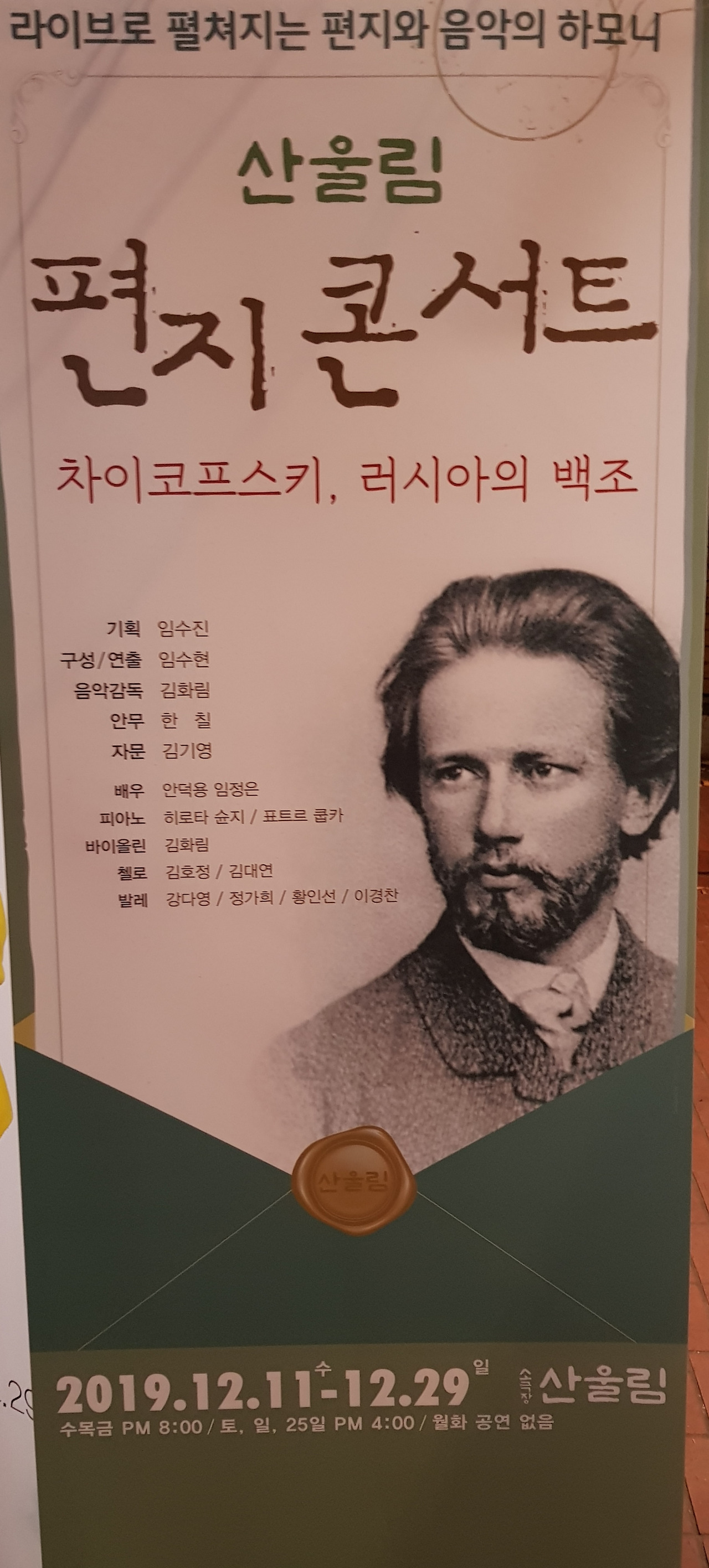 산울림 편지 콘서트를 이제야 만났다. 매년 한 명의 클래식 음악가를 주제로 그들이 남긴 음악을 약간의 연극적 각색과 더불어 라이브로 즐기는 기획인데, 올해의 주인공은 차이코프스키다. 두 명의 남성 피아니스트가 연주한 피아노 협주곡 1번의 압도적인 곡으로 시작된 무대는 차이코프스키의 남동생 모데스트의 나레이션으로 진행돼간다. 그의 유명한 발레음악들과 더불어 실제 발레리나(노)가 등장하기도 하고, 현악기들이 추가되면서 소리는 더욱 다채로와 지고 풍성해졌다. 늘 크고 번듯한 공연장 무대에만 섰던 연주자(무용수)라면 코 앞에 관객들을 두고 한 이번 공연이 관객 만큼이나 색다른 경험이었으리라. 연주되는 피아노 건반을 피아니스트의 손과 더불어 숨죽여 바라본 긴장된 경험과 더불어, 모처럼 스피커가 아닌 악기의 살아있는 소리에 취해, 예상을 훌쩍 뛰어넘는 좋은 시간이었다. 12/29일까지 산울림소극장
