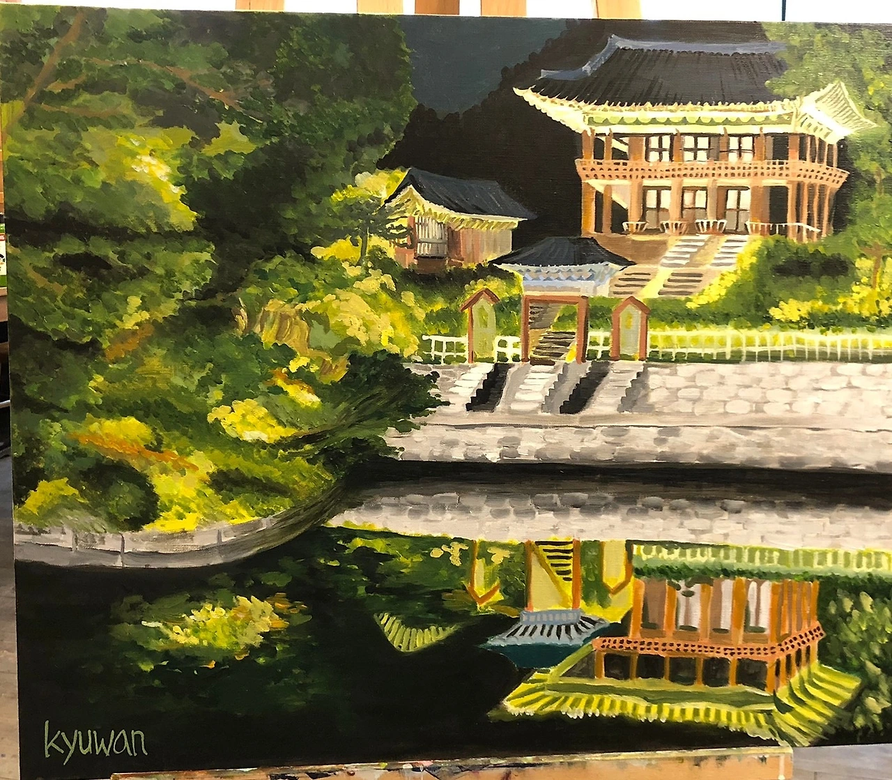 창덕궁 주합루 야경. 유화. 8호 크기의 그림만 그리다가 처음으로 20호 큰 그림에 도전! 사진에 비해 가로가 더 짧은 캔버스때문에 전각이 세로로 길어진 느낌. 그림의 크기도 크고, 물에 비친 전각을 또 그려야해서 생각보다 그리는데 시간이 너무 많이 들었다. 이 주에 한번 씩 몇 달간 매달리다보니 쫌 지겹기도 하고, 작업이 너무 늘어지는 듯 해서, 선생님은 한 타임 더 해보기를 권유하셨지만 오늘 굳이 서둘러 마무리했다. 미진한 부분을 덧칠하다보니 도대체 유화의 완성은 언제, 어떻게 가능할까 싶다. (역시 예술의 길은 멀고도 험난... ^^;)