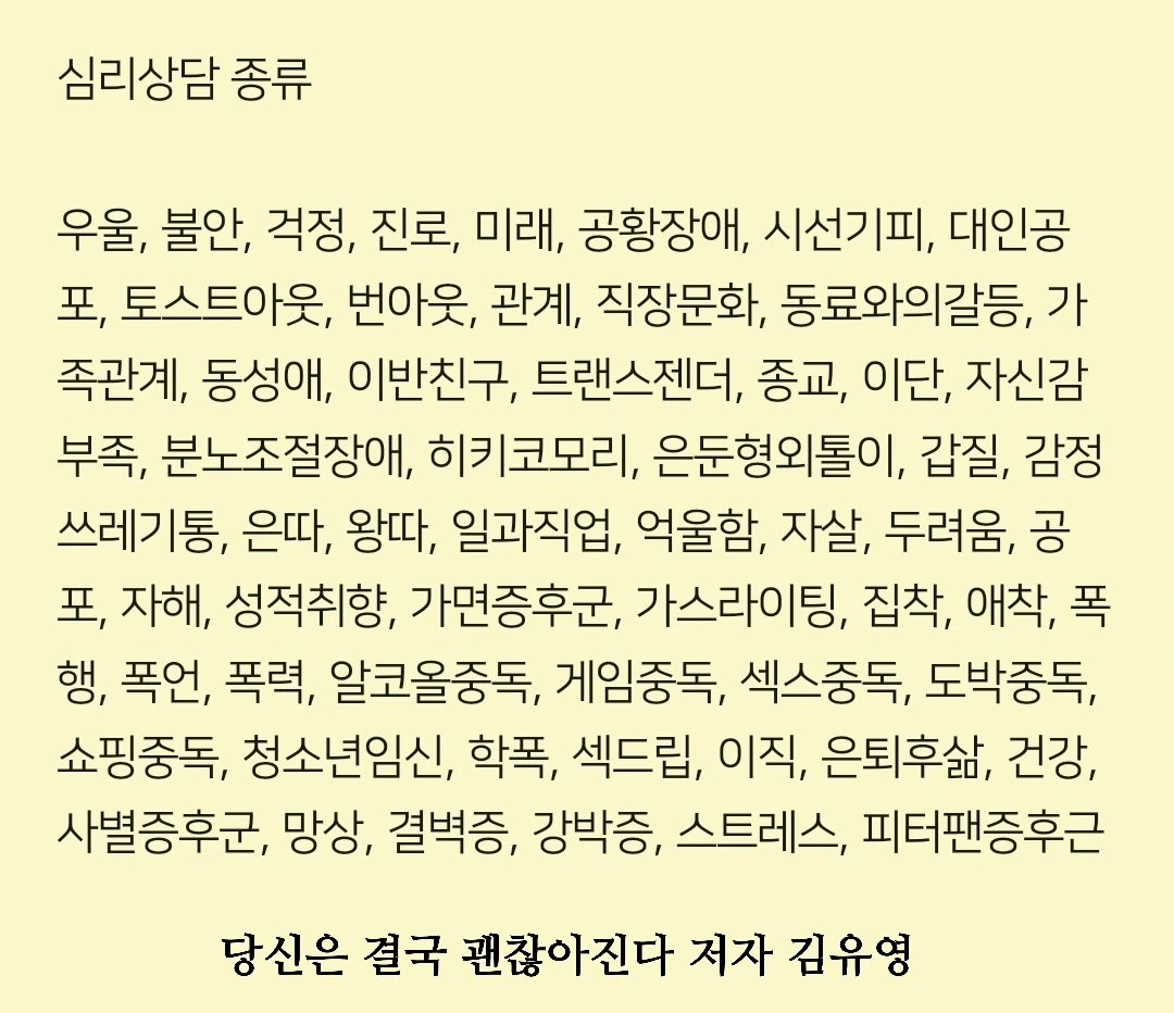 작가 겸 숨고에서 심리상담사로 활동하고 있는 긍정마법사 김유영입니다. 이곳이 지치고 힘든 당신의 마음이 잠시나마 쉬어갈 수 있는 사랑방처럼 너나들이할 수 있는 공간이기를 바랍니다.