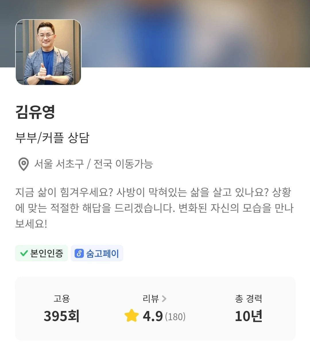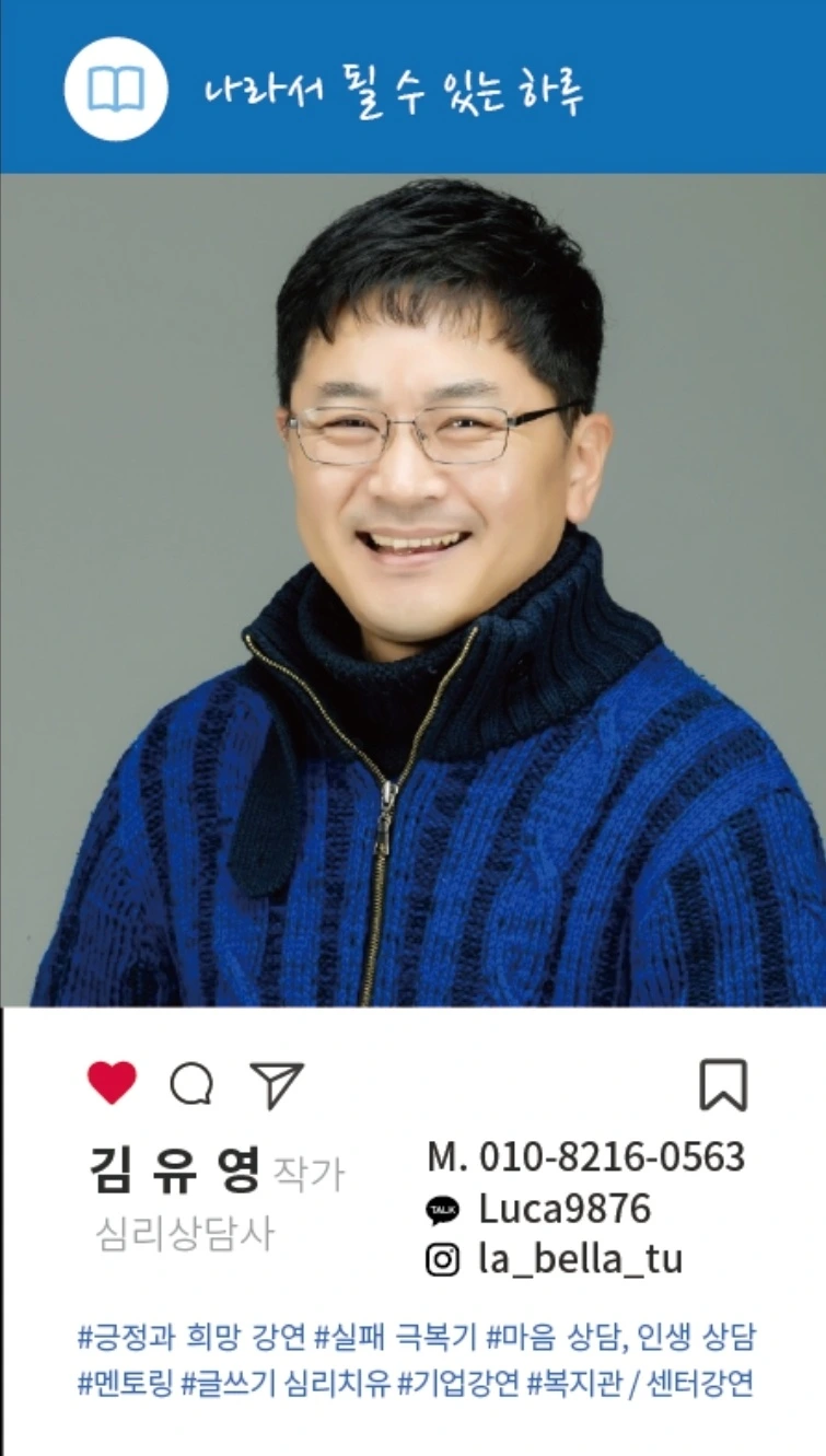 작가 겸 숨고에서 심리상담사로 활동하고 있는 긍정마법사 김유영입니다. 이곳이 지치고 힘든 당신의 마음이 잠시나마 쉬어갈 수 있는 사랑방처럼 너나들이할 수 있는 공간이기를 바랍니다.