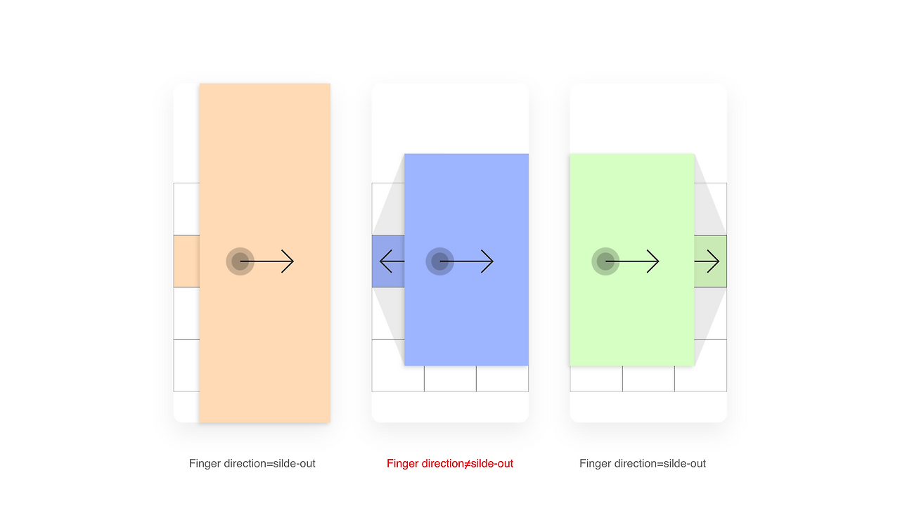 그 외 사소한 인터랙션에도 변화가 생겼다. 기존에는 게시글에서 목록으로 빠져나올 때, 주황색 예시처럼 좌에서 우로 slide-out 되는 방식이었는데, 이제는 3*3그리드 목록의 사진 크기로 줄어드는 인터랙션으로 변화된 것이다. 문제는 우리의 finger direction이 대부분 좌에서 우로 향한다는 점인데, 따라서 두번째(파란색) 경우처럼 사진이 그리드 중 가장 왼쪽에 위치한 경우, 내 행동과 인터랙션이 일치하지 않는 문제점이 발생한다.