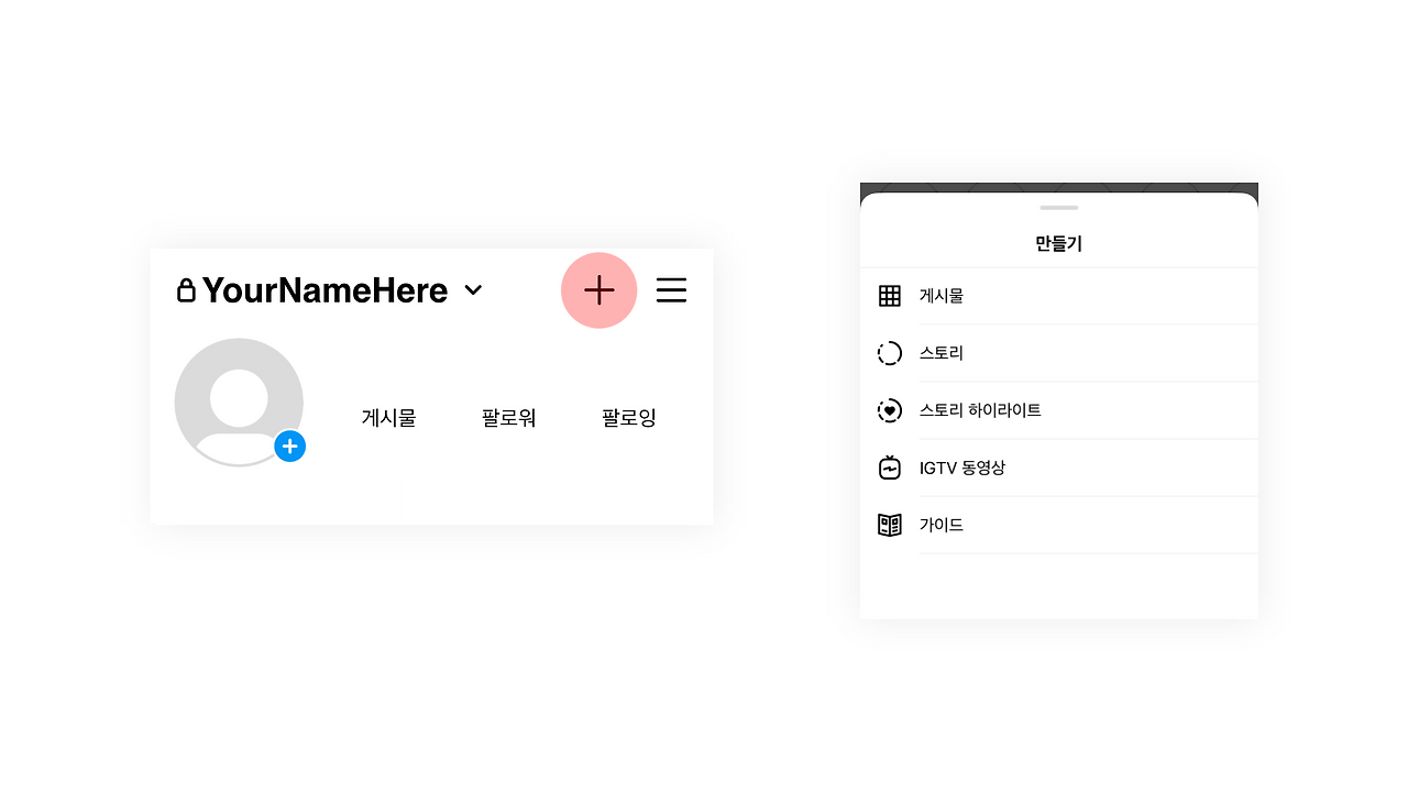 프로필 상의 변화도 두드러진다. 기존 가운데 정렬로 되어있던 아이디가 좌측으로 이동하면서 글씨가 더 커지고 우측에 +버튼이 추가되었다. 기존 별도로 존재했던 컨텐츠와 게시글 업로드, 그리고 자동 생성되었던 IGTV를 '생성'이라는 키워드로 한 데 묶어 제공하며, '가이드'도 제공한다.
