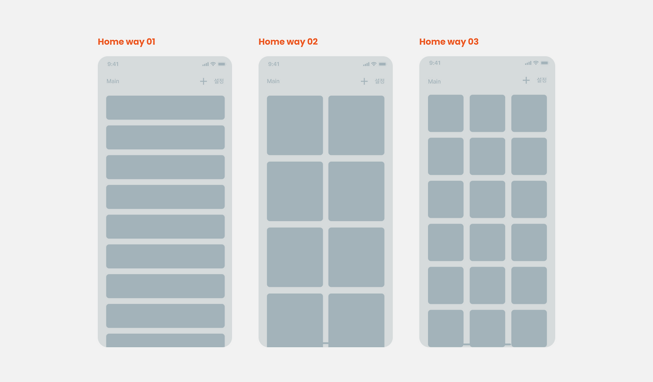 특히 홈 화면은 영감을 추가하고 볼 수 있는 스테이션이었기 때문에, 어떻게 구성하고 어떤 모양새를 갖출지 가장 신중하게 고민해야 했다. 우리는 ‘예쁘고 안정적인 모양새'보다 ‘사용자 친화적인 모양새'를 우선순위로 두었기 때문에, 아래와 같이 3가지 정도 와이어프레임 시안을 제작해두고, 설문조사 결과를 반영하여 결정 및 보완하기로 했다.