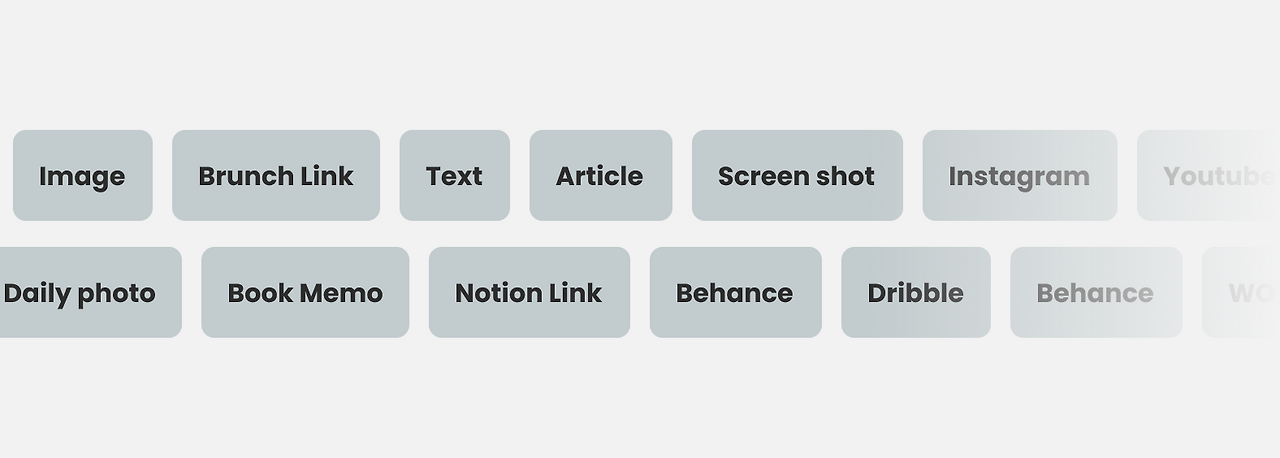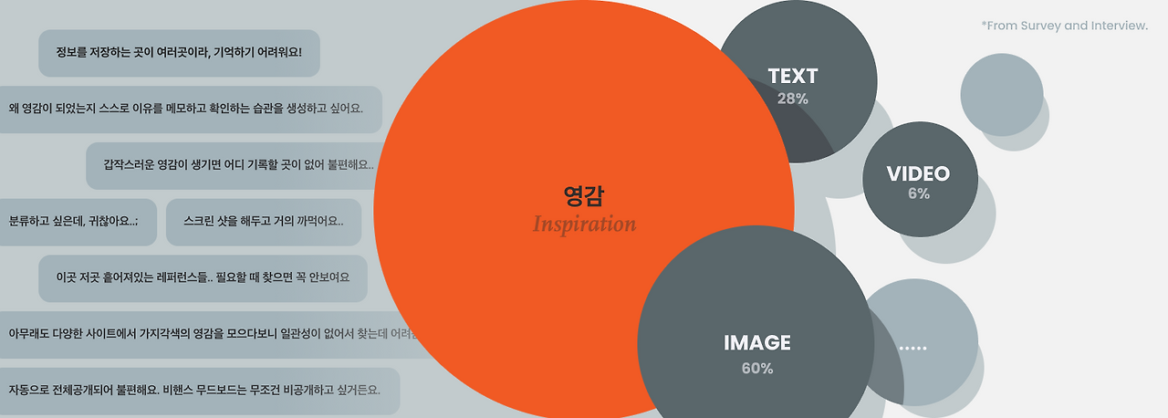 조사 결과 이미지를 아카이빙하는 사용자들의 비율이 압도적으로 많았다.(101명 중 60명이 응답) 따라서 이미지를 아카이빙하는 사용자들을 위한 컴포넌트를 제작하되, 무시할 수 없는 비율을 가진 다른 유형의 영감 역시 매끄럽게 보일 수 있도록 배려해야 했다.