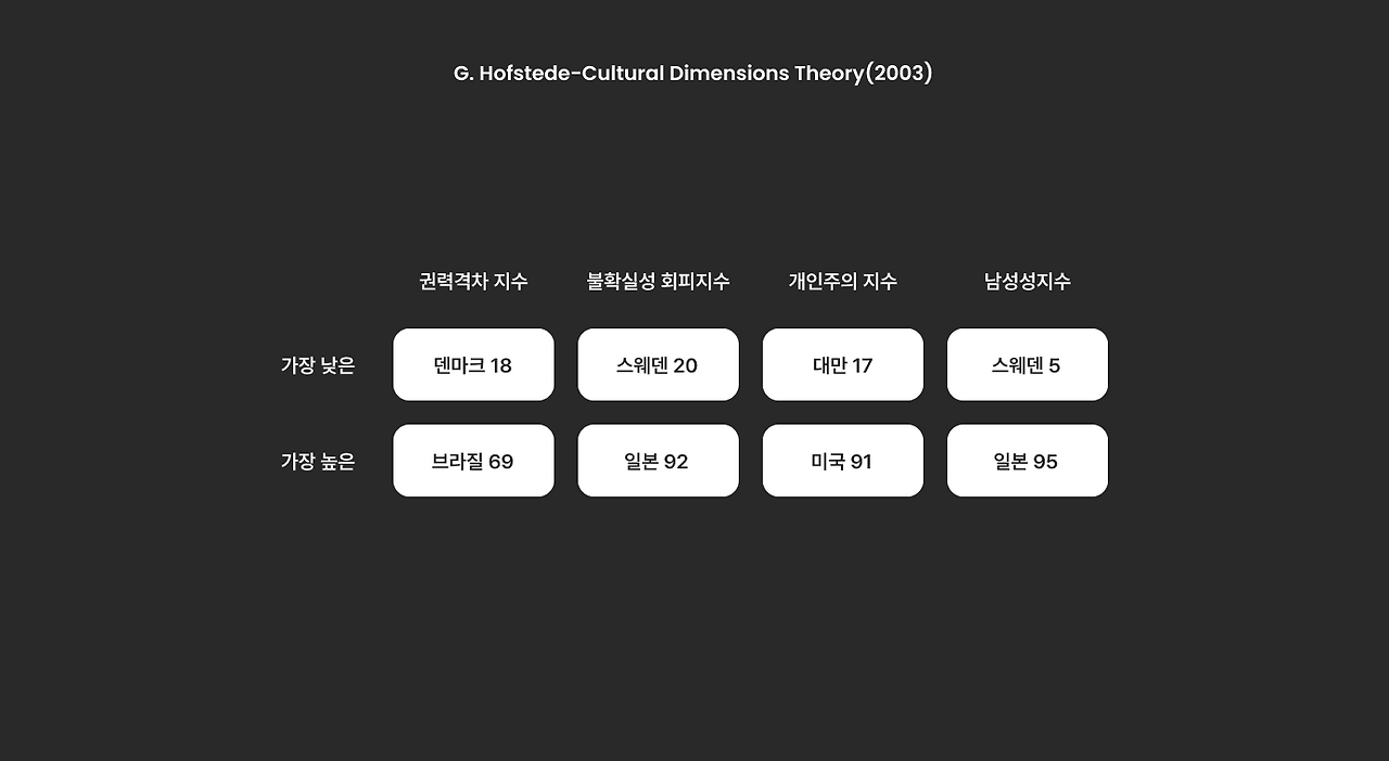 문화는 앞서 설명한대로 ‘고맥락인가' ‘저맥락인가’에 따라 크게 분류되지만, 이것이 유일한 분류 기준은 아니다. 국가별로, 민족별로, 나이대별, 집단별로 상이한 문화를 형성하기 때문이다. 인간 특성이 다양하고 셀 수 없는 것과 문화의 다양성은 정비례관계를 이룬다. 그중에서도 특히 ‘국가’는 역사, 영토 등 상당부분 공유되고 공감될 수 있는 부분이 많아서 좋은 구분책이 되어준다. (물론 항상 ‘국가마다' ‘문화가 다른 것’ 은 아니다.) 이와 관련하여 네덜란드의 사회심리학자 호프스테더(G.Hofstede)가 각국을 비교한 흥미로운 자료가 아래에 있다. 세계의 문화를 4가지의 기준으로 평가하고 각국 문화의 특성을 규정한 것이다.