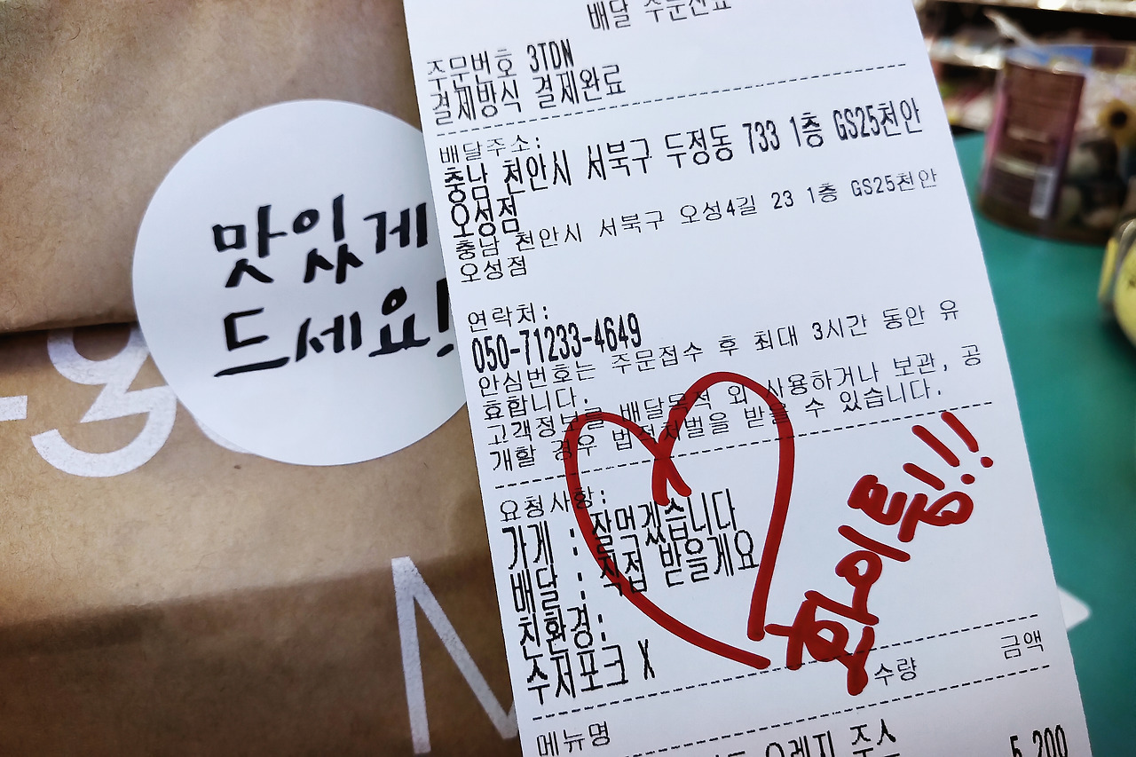 오늘 새벽엔 오랫만에 맥모닝이 먹고 싶었는데 오늘따라 맥도날드가 어플 주문을 닫아놔서 고민하다가 배민을 켰다. 그나마 공통분모인 것 같은 [에그드랍]으로 결정. 새벽엔 배달료가 비싸니까 아꼈던 쿠폰과 포인트를 잔뜩 써서 음료와 함께 시켰다. 예상 시간보다도 빨리 도착한 식사의 주문서에 귀여운 메모가 적혀있어 지금 이 글을 쓰고 있다. 내가 요청사항에 남긴 ‘잘 먹겠습니다’에 하트를 그린 후 ‘화이튕!!’이라는 발랄한 답장. 배달지가 편의점인 것을 확인하고는 그분도 모종의 전우애가 느껴졌나 보다. 찌찌뽕.