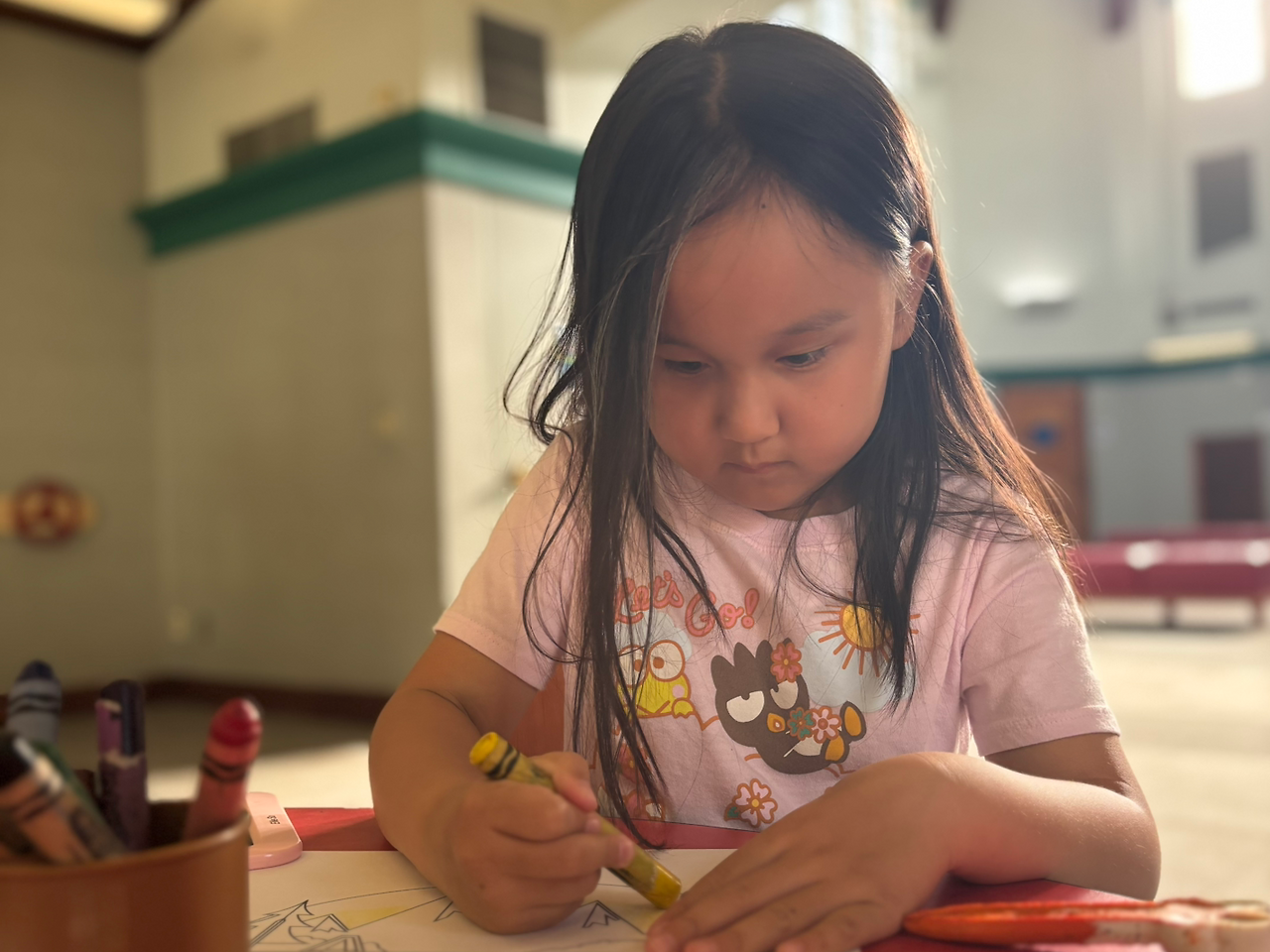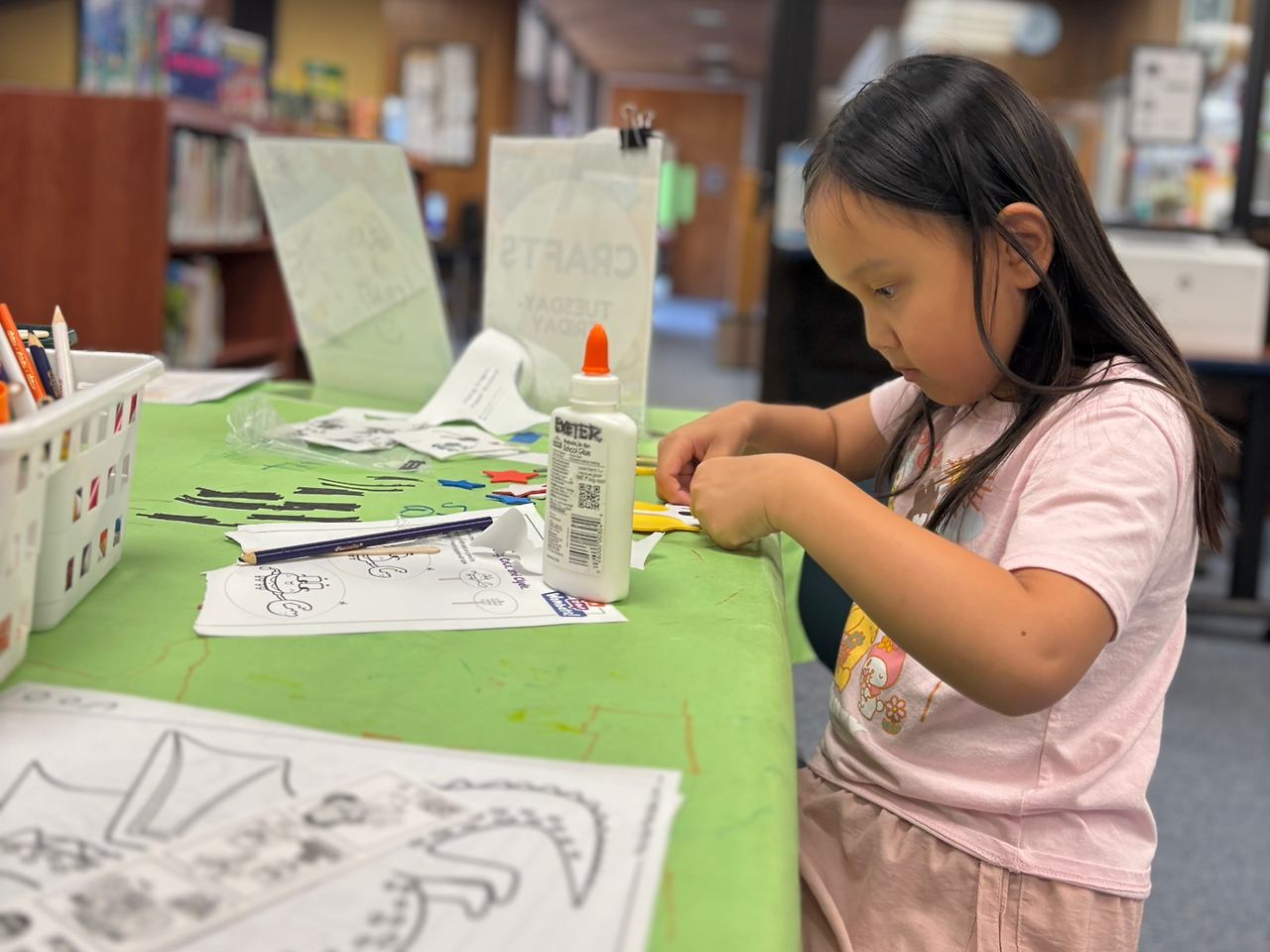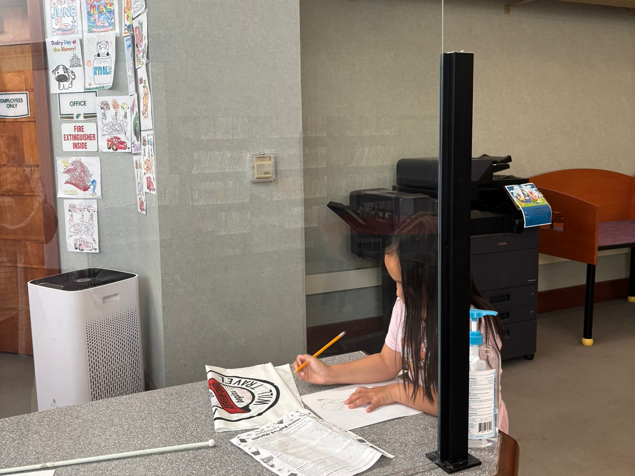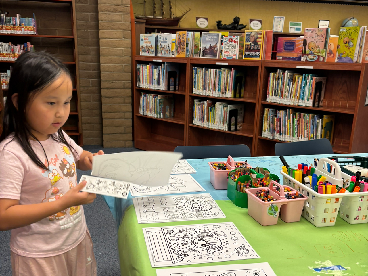 그래도 엘리는 신나게 그 공간 안으로 뛰어들었다. 한쪽에는 할머니와 손자가 책을 읽고 있었고, 한 명의 사서가 그 공간을 지키고 있었다. 엘리는 사서에게 다가가 색칠 도구를 받아와 테이블에 앉아 색칠을 시작했다.
