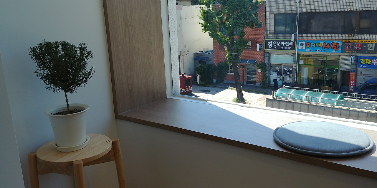 창가에 화분이 있는데 마치 케이크에 장식된 이파리와 닮아