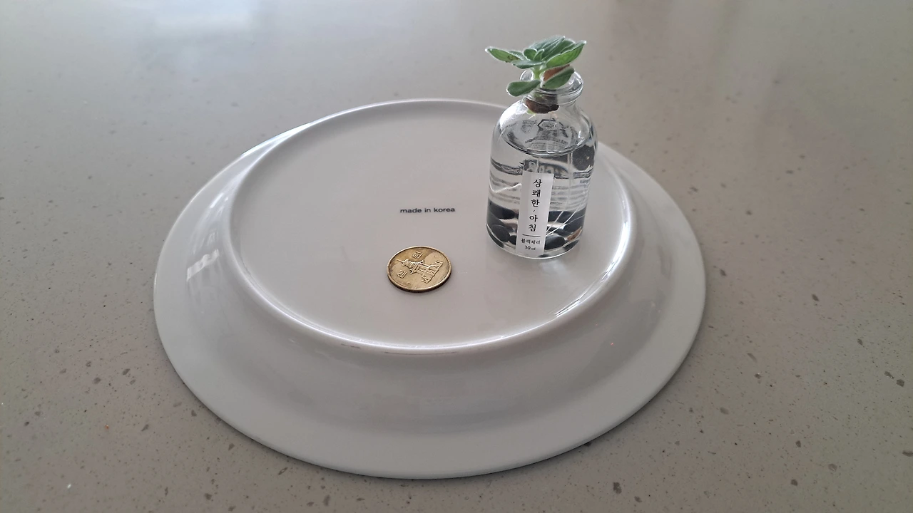 레인지에 넣어 돌릴 생각을 하다 보니 혹시 접시 바닥에 여직 스티커를 붙인 채 사용하고 있는지도 모른다는 생각이 들었다. 이럴 때의 촉은 거의 맞다. 주로 샐러드만 담았던 것이라 미처 딱지를 떼지 못했는데. 아니 잊고 썼던 거지. 드디어 레인지 속에 들어갈 테니 점검을 하라는 계시는 하늘이 나를 지켜보고 있다는 증거이다. 어쩜 몇 달을 사용한 접시의 스티커가 이렇게 깔끔할까? 물에 젖지도 않았나 봐. 새것 같아. 심지어 접시 바닥에서 슬슬 잘 떨어지는 것이 고급종이를 사용한 듯하다. 만약 스티커의 전문가가 이 글을 읽고 있다면 반론할지도 모르겠지만, 적어도 접시 바닥에 스티커는 손톱으로 긁어내도 지저분하게 들러붙어 골치를 썩는 법이 한두 번이 아니었다. 그런데 오늘 아침 정신없이 토스트를 완성하기 위한 빈티지접시 바닥에 붙은 스티커가 멀쩡히 살아있었고 손톱으로 살짝 긁었을 때 찢어지지도 않고 잘 떼어내 진다는 사실이 너무나 훌륭하게 감사할 지경이었다. 뜯어낸 자리에 ‘메디인 코리아’를 발견하는 순간, 아, 역시. 88 올림픽의 감격이 살아나듯 한국산이 최고구나 싶은 만족감에 아침이 다 뿌듯해지는 것이었다. 일이 이렇게 순조롭게 된다는 자체가 기분을 망치지 않고 그럭저럭 아침을 넘길 수 있다는 것.