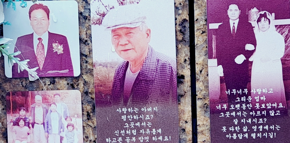 물방울이 가시지 않은 사진을 어루만지며 기일을 지키는 엄마의 마음.