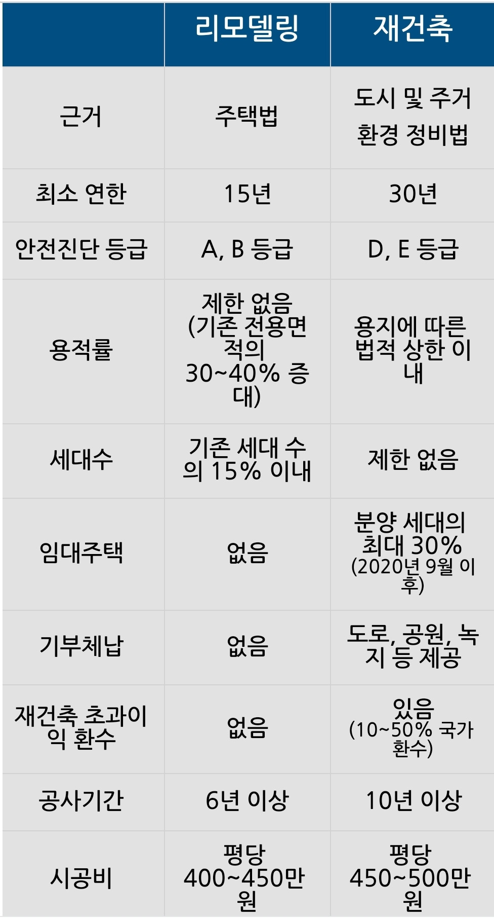● 기부체납 : 재건축은 정비 사업으로 지정이 필요하며 그에 합당한 사회적 기여를 의무화하고 있습니다. 기부체납을 통해 정부는 주변 환경을 개선하거나 공공시설을 공짜로 받아 가는 겁니다. 반면 리모델링은 아파트 입주민이 주거환경 개선을 하기 위한 것으로 따로 지정 없이 입주민의 동의하에 진행이 가능합니다. 비용적 측면에서 유리할 뿐만 아니라 정부의 컨트롤에서 벗어나기 때문에 사업 기간에서도 유리합니다. ● 재건축 초과이익 환수 : 말 그대로 재건축 시 발생하는 이익을 정부가 환수해 가겠다는 겁니다.;;;; 기부체납도 하고 임대주택도 지었는데 이익도 뺏어간다니 황당하지만 법이랍니다. 악법도 법이니 따라야 겠지요. 다행히 리모델링은 재초환에 해당되지 않습니다. ● 시공비 : 시공비는 연면적기준으로 산정이 되는 사항으로 추가 분담금 과 직결되어 사업성 측면에서 가장 중요한 부분입니다. 단지의 규모와 고급화와 연결되어 있기 때문에 정확한 금액을 산정하기 어렵습니다. 일반적으로 재건축대비 리모델링은 시공비가 80~90%가 필요하다고 하나 실제 정비업체와 상담을 하면 재건축비용과 거의 동등한 수준으로 예측을 합니다. 리모델링 추진시, 여러 정비업체와 같이 리뷰를 할 필요가 있고 시공사 선정시에도 입지에 따라 얼마나 많은 업체가 입찰하느냐에 따라 시공비 경쟁이 치열할 수 있습니다. 리모델링은 재건축 대비 용적률이 불리한 경우 고려될 수 있으며 상대적으로 규제가 완화되어 있어 입주민들의 의지가 확고하다면 충분히 진행이 가능하다고 봅니다. 특히 1990년대 2000년대 아파트들은 재건축하기에는 어려운 용적율을 가지고 있어 가격경쟁력에서 소외되고 있으나 입지가 출중하다면 눈을 씻고 다시보시기 바랍니다. 주변 신축의 시세가 얼마나 가는지.. 갭이 너무 많이 차이가 발생하는 건 아닌지... 정비업체와 상담을 해보면 신규분양세대를 통해 사업비를 최대한 충당해야 하므로 추가분담금을 고려한다면 세대 분양가나 주변신축이 평당 2800만원 이상으로 책정이 가능하다면 리모델링에 도전해 볼만 하다고 합니다.