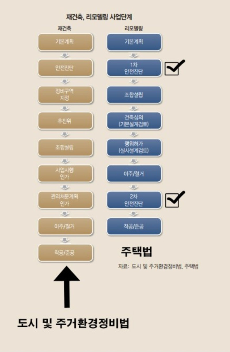 리모델링과 재건축의 물리적인 차이점은 아파트의 뼈대인 골조를 유지하느냐 아니면 빈땅을 만들기 위해 허물느냐입니다. 재건축은 기존의 아파트를 모두 허물고 빈땅에 새로운 건물을 올리는 반면 리모델링은 아파트의 기본이 되는 골조는 남겨두고 골조를 보강하여 새로운 건물을 올리는 것입니다. 결과론적으로 둘 다 신축이 되지만 재건축은 새로 건물을 짓는 것이기 때문에 평면 설계에 자유롭지만 리모델링은 기존 골조의 내력벽은 유지해야 하므로 평면 구조 측면에서 불리합니다. 구조적인 불리함이 있음에도 리모델링 사업이 주목받아야 하는 이유는 재건축 대비 상대적으로 덜한 규제와 사업성 때문입니다.