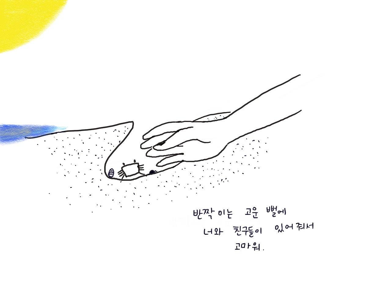 희생자들은 바닷속에서 둥둥 떠 다니다 점점 작은 원소 알맹이로 내 손으로 돌아왔을지 모른다. 이 게들과 작은 고동의 껍데기 위에 업혀있을지 모른다. 어느 동굴 속에 갇혀있다면 생물 친구들이 다가와 어루만져 줄지 모른다. 혼자가 아니다. 그저 그렇게라도 가족들에게 위로를 전하고 싶다.
