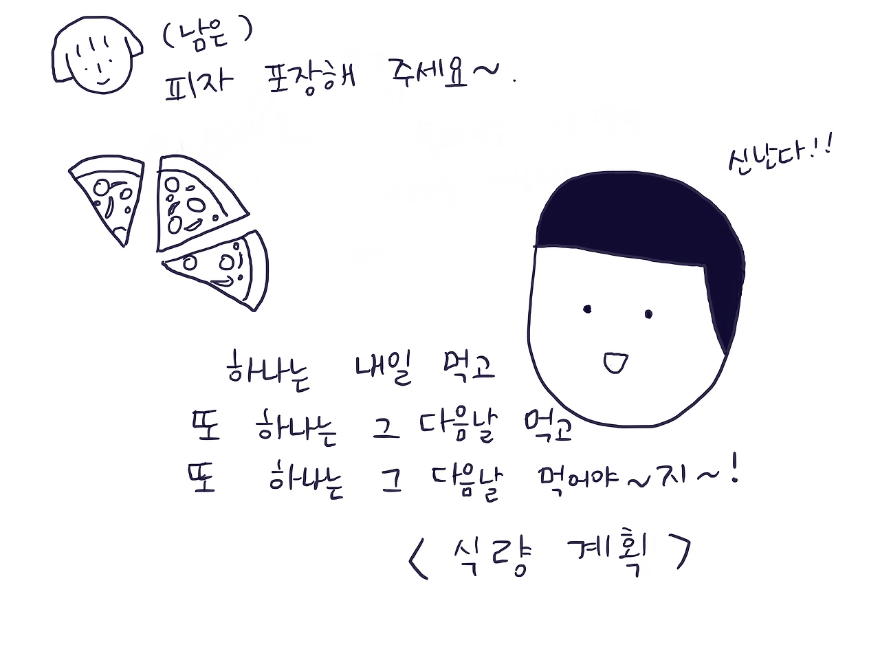 어쩌다 식당에 가서 음식이 남으면 꼭 포장을 해온다. 아이의 간식이나 다음 끼니 반찬으로 쓰기 위해서다. 피자가 세 조각이나 남은 날이 있었다. 자연스럽게 포장을 하였는데 아이가 신나서 먹을 계획을 세운다.