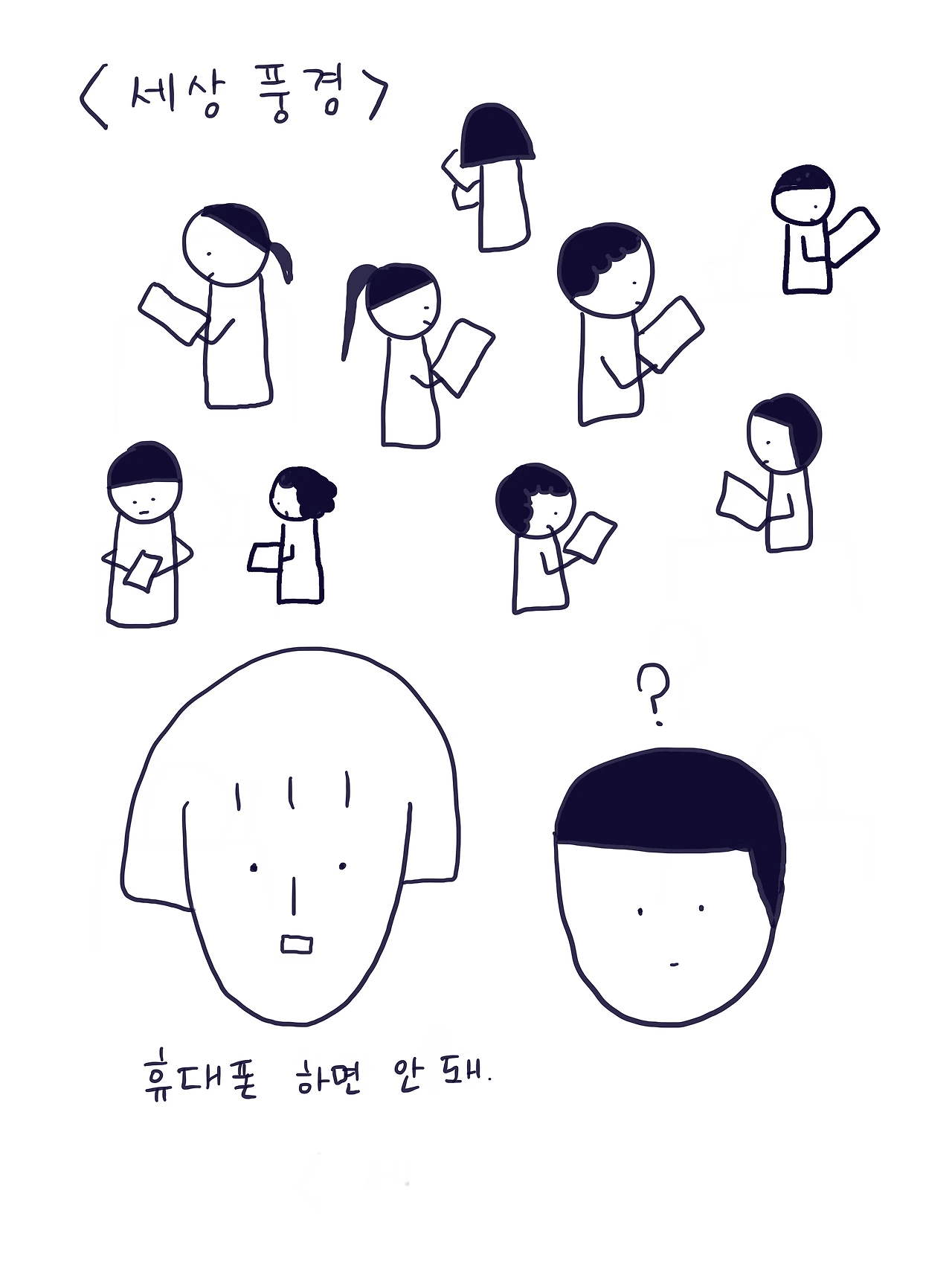 사실 주위를 둘러보면 민망할 때가 많다. 아이와 같이 버스나 지하철을 탈 때, 놀이터나 학교 앞에서, 식당에서, 친척들이 오랜만에 모인 집에서조차 등 거의 모든 공간에서 거의 모든 사람들이 휴대폰을 보고 있기 때문이다. 휴대폰을 하면 안 된다고 말하는 것이 나부터도 얼마나 모양이 빠지는지.