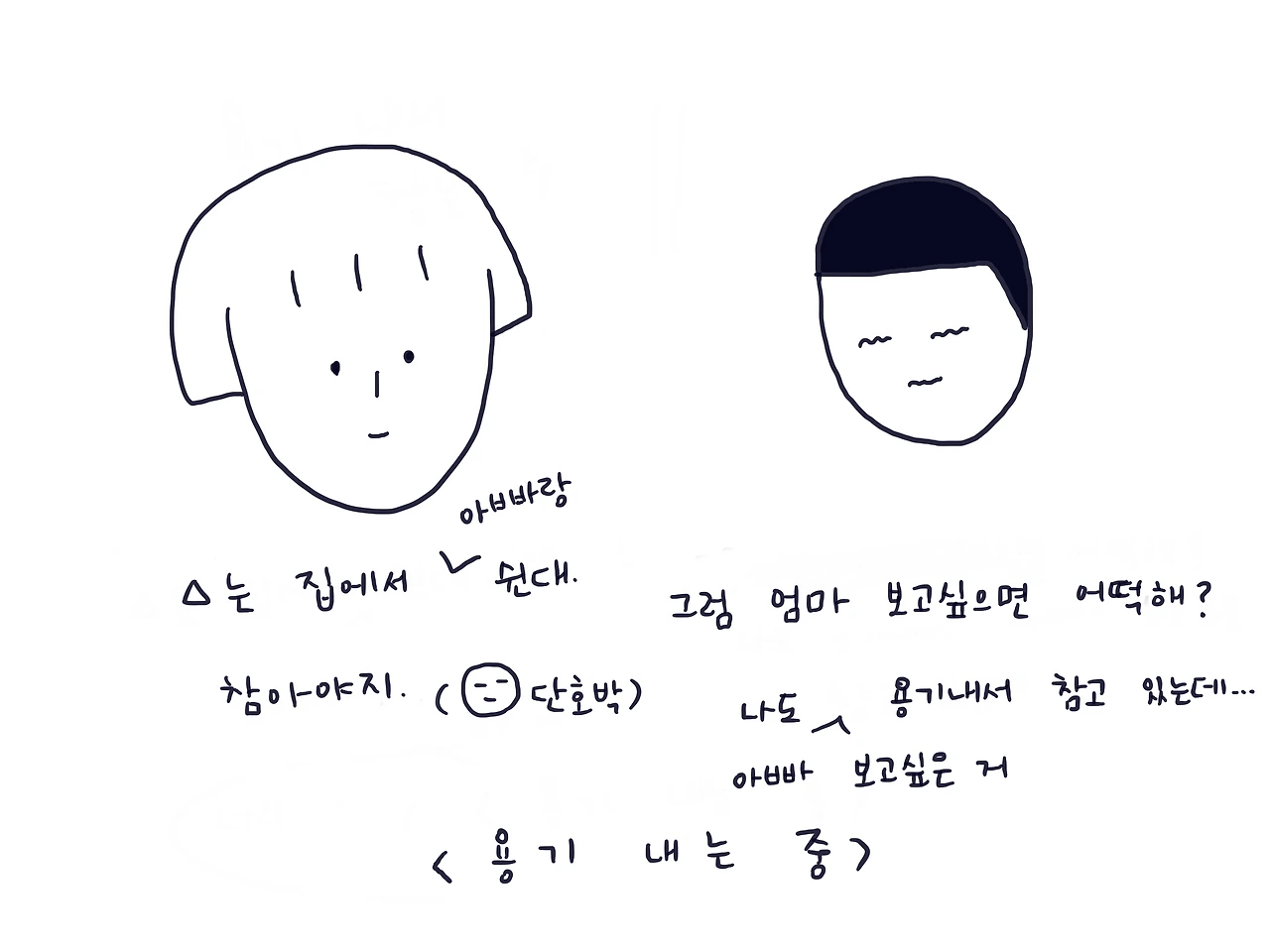 친구 동생이 엄마와 떨어져 있다는 소식을 듣고 나눈 대화. 자기도 오늘 아빠가 보고 싶은 것을 용기 내서 참고 있다고 말하는 아이. 아무 말 없어서 괜찮다고 생각했는데도 아이 속 마음 한 켠에는 애쓰고 있었나 보다. 보고 싶어도 참아야지라고 말하는 나. 조금씩 아이의 마음도 나의 마음도 단단해져 가겠지. 수호천사님, 우리에게 용기를 주세요.