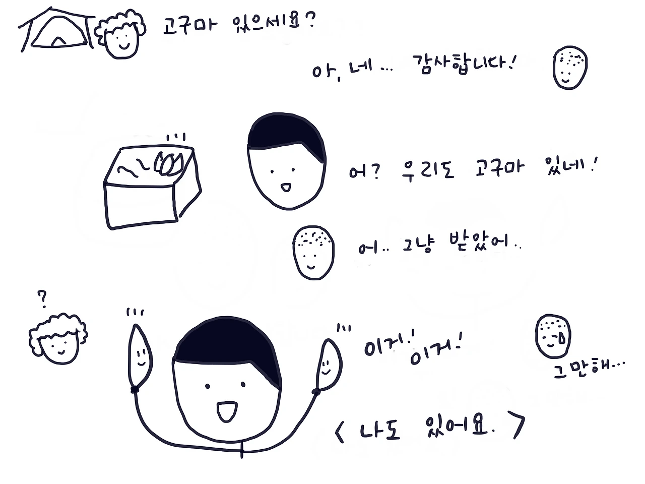 아이들은 부끄러움을 잘 모른다. 아직 그만큼 크지 않았기 때문이다. 캠핑을 갔다가 옆 텐트 이웃님께서 남는 고구마를 주고 가셨다. 우리도 가져 오긴 했는데 조금만 가져 와서 일단 받긴 받았다. 그런데 잠시 후 아이가 우리가 가져 왔던 고구마를 발견하고 말았다. "이거! 이거!"라면서 자랑스럽게 우리 고구마를 그분께 보여주는 일. 어른으로서는 참 민망한데 아이들은 당연한 일. 자랑이 아니라 그저 이야기를 나누고 싶은 일.