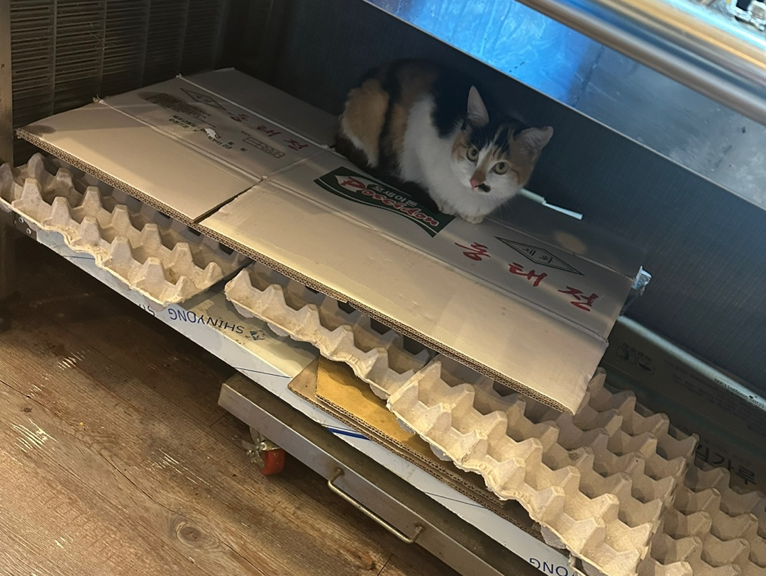 눌러앉아버린 이 고양이는 코에 점이 콧물처럼 나있어서 콩물이라고 이름 짓고, 가게에 놀러오면 잘 돌봐주었죠. 황금이가 직접 데려온 콩물이가 너무 귀여웠지만, 음식점이고, 불을 다루는 업종 특성상 너무 위험해서 어쩔 수 없이, 가슴 아픈 결정을 해야했어요.