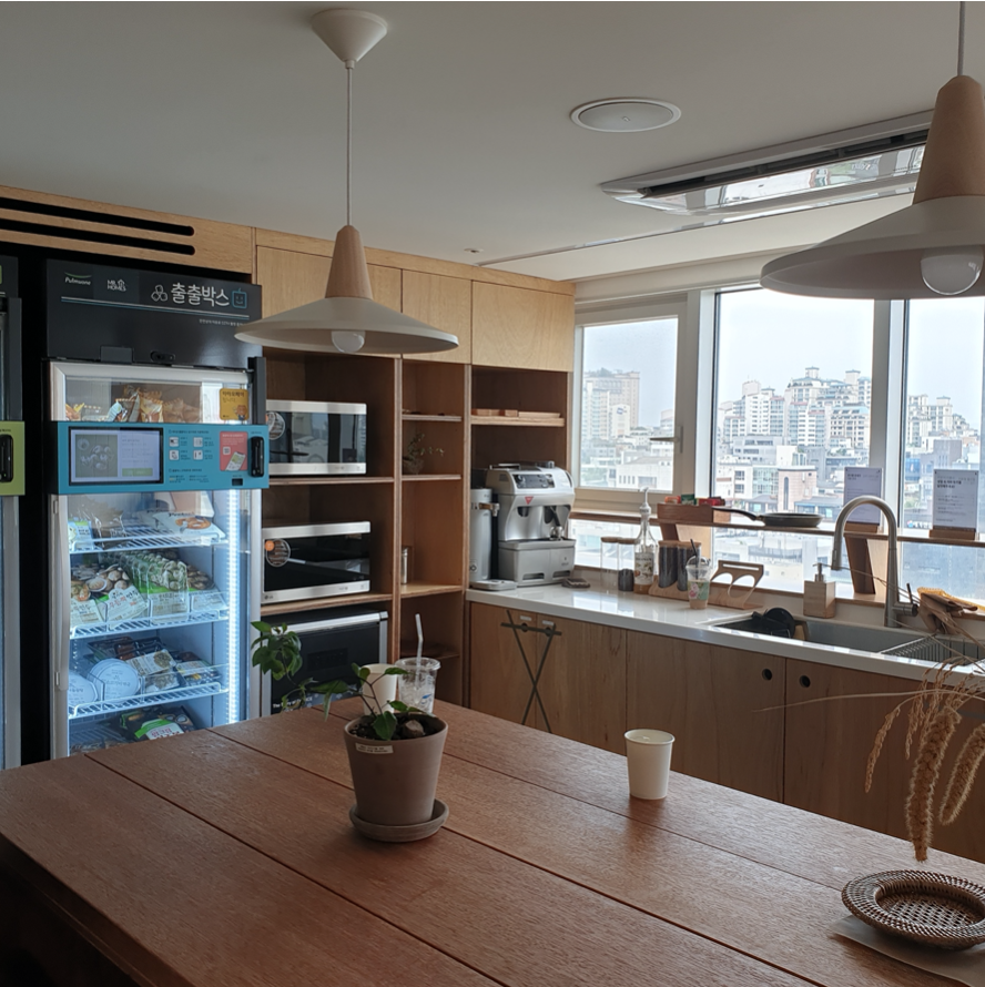 안내에 따라 처음 다다른 곳은 13층에 위치한 홈즈 리빙 라운지였다. 엘리베이터에서 내리자마자 마주한 것은 큰 모니터였는데, 그곳에는 여러 공유 공간의 공기 상태와 야외 기상 상황 정보가 실시간으로 업데이트되고 있었다. 더욱 깊숙이 들어가 보니 다양한 IoT 가전제품 및 스마트 자판기가 구비되어 있었음은 물론, 천장에는 공유 거실의 무인 운영을 원활히 하기 위한 센서까지 붙어 있었다. ‘가장 미래적인 코리빙 스페이스’. '홈즈스튜디오 선정릉'의 첫 인상은 그렇게 시작되었다. ‘홈즈스튜디오 선정릉’의 기술은 내 방과 공유 거실 곳곳의 IoT 시스템으로까지 존재하면서 입주민들의 모든 일상에 함께한다. 혼자 사는 삶을 풍요롭게 해줄 모든 서비스의 디지털화를 꿈꾼다는 매니저의 말을 들으니, 공실이 거의 없는 입주 상황이 단번에 이해되었다. 한편으로는 이러한 기술 사용이 입주민들을 얼기설기 모으고 교류하게끔 하는 방향으로까지 나아간다면 어떨까, 하는 생각이 잠시 스쳐지나가기도 했다.