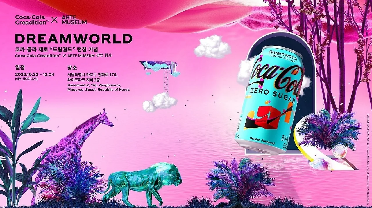 세계적 음료 기업 코카콜라의 경우 몰입형 미디어 아트 전시관인 아르떼뮤지엄과의 콜라보를 통해 팝업 전시를 기획했습니다. ‘드림월드’팝업은 오감을 통한 체험 전시를 선보이면서 코카콜라의 신제품을 자연스럽게 홍보하고, 방문자들에게 몰입과 예술적 경험을 선사했죠.