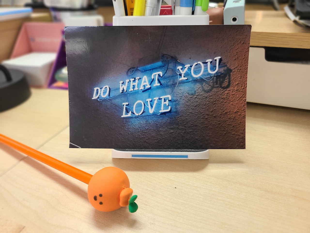 ‘내가 좋아하는 삶을 살아가자’는 것이 제 인생 가치관입니다. 그러다 보니 삶에 있어서 정말 중요한 직업을 선택할 때도 역시나 제가 가장 재미있고 즐겁게 할 수 있는 일을 선택했죠. 그런데 아무래도 광고 쪽이 쉬운 직업은 아니다 보니 가끔 힘들고 지쳐서 이를 망각할 때가 있거든요. 그래서 이 일을 선택했을 때의 마음을 떠올리기 위해 좋아하는 문구를 붙여 두었습니다! 중.꺽.마✊