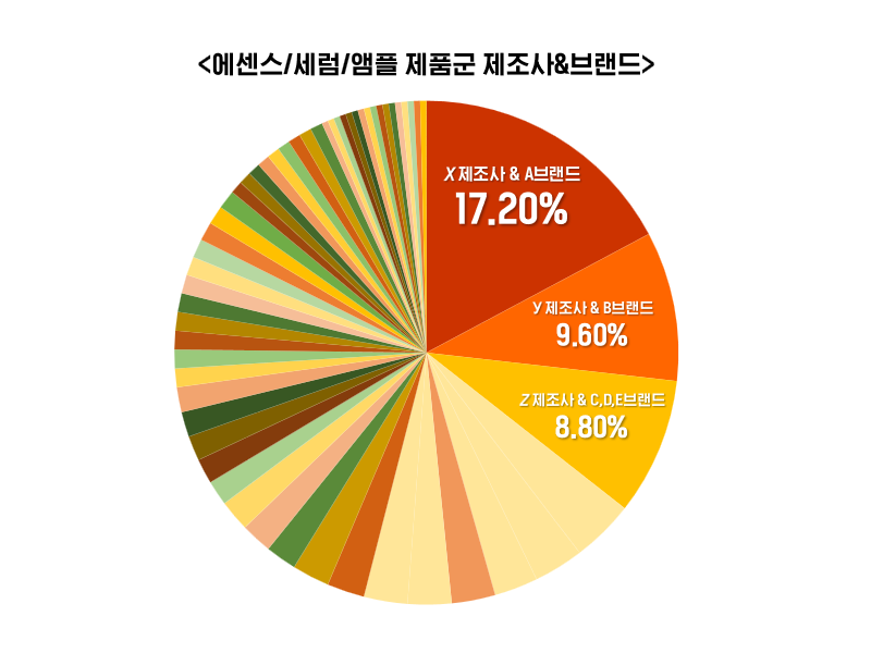 20-21 매크로-메가 인플루언서들이 진행한 에센스류 공구에서 17.20%의 비중으로 진행 1위를 차지한 X 제조사. X 제조사의 A 브랜드 역시 에센스류 공구 진행 횟수 1위를 차지했습니다.