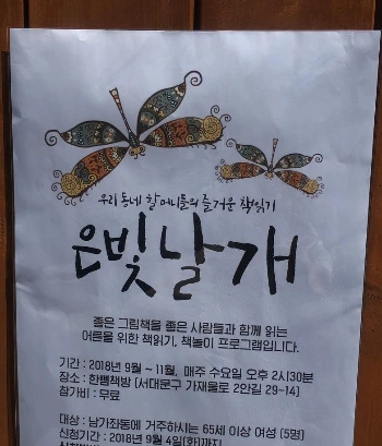 가재울 마을건강방의 운영주체 중 하나인 하.나.의. 공동체 주민 중 한 명이 동네를 위한 활동을 해보고 싶다고 했다. 자신의 관심을 살려 독서모임을 해보고 싶은데 함께할 참여 대상을 아이들로 할지 할머니로 할지 고민하고 있었다. 조금 염치없지만 아이들보다는 마을 건강방에 오신 할머니들을 대상으로 해보면 어떻겠냐고 설득했다. 아이들을 기르는 엄마인지라 아이들이 좀 더 편한 대상이고 나이 많은 어르신들과는 이런 모임을 해본 적이 없어 망설이기는 했지만 어렵게 설득하는 데 성공했다. 그렇게 해서 동네 할머니들을 위한 독서모임인 '은빛날개'가 탄생할 수 있었다.