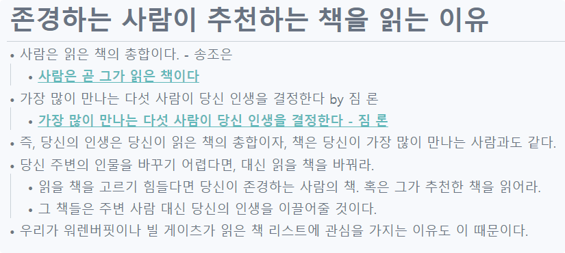 나는 "내가 존경하는 사람이 추천하는 책을 읽음으로써 성장할 수 있다."라는 생각을 가지고 있다.