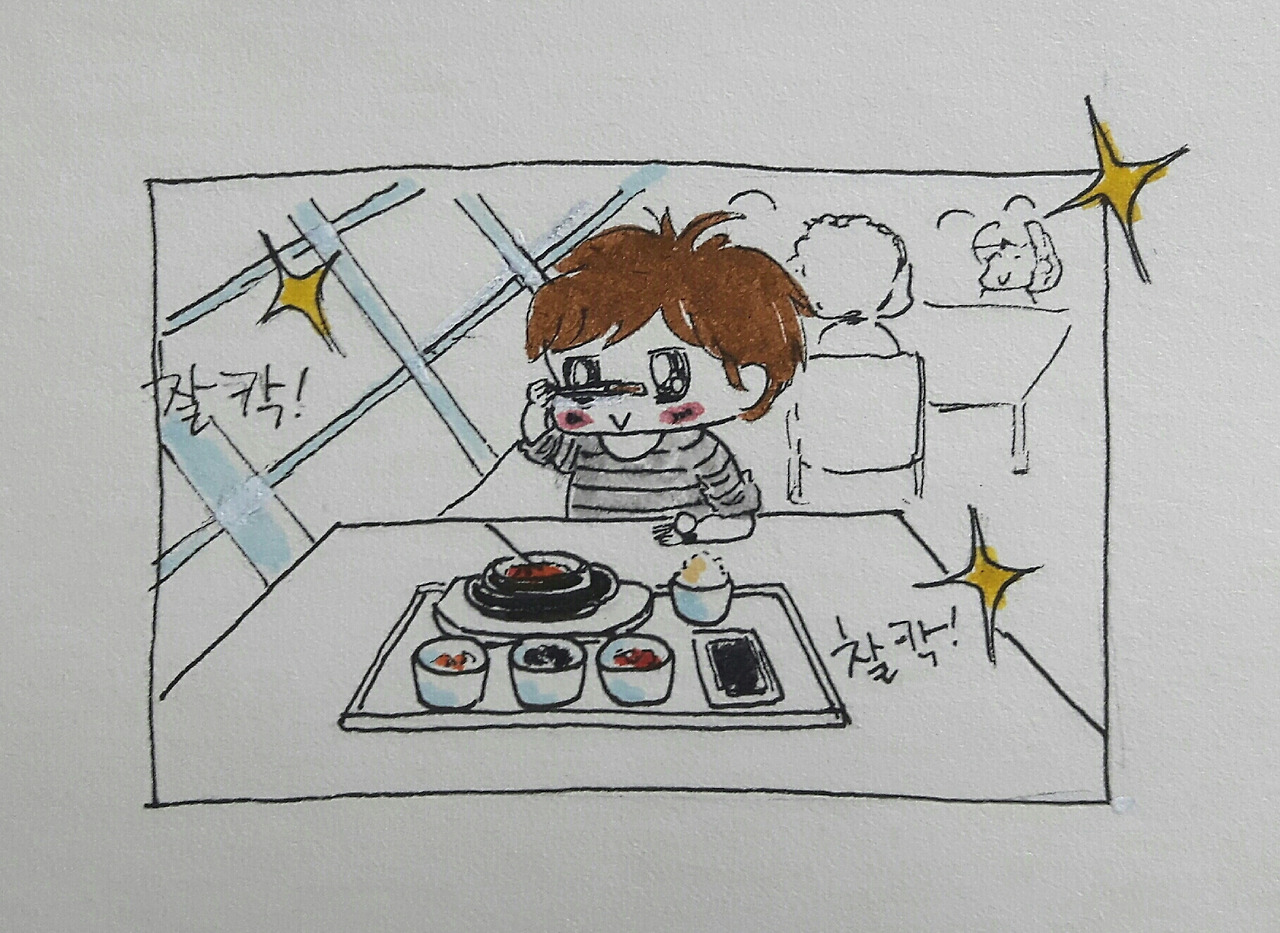 찌개가 나오니 기분이 얼마나 좋았는지 그 싫어하는 카메라 앞에서 이런저런 포즈까지 취해주고 심지어 일년에 한 번 볼까말까한 미남포즈(본인이 세계최고 미남이라 상상하며 취하는 포즈로 자신감이 무엇보다 중요함)까지 취해주는거다.