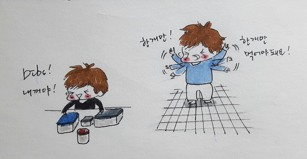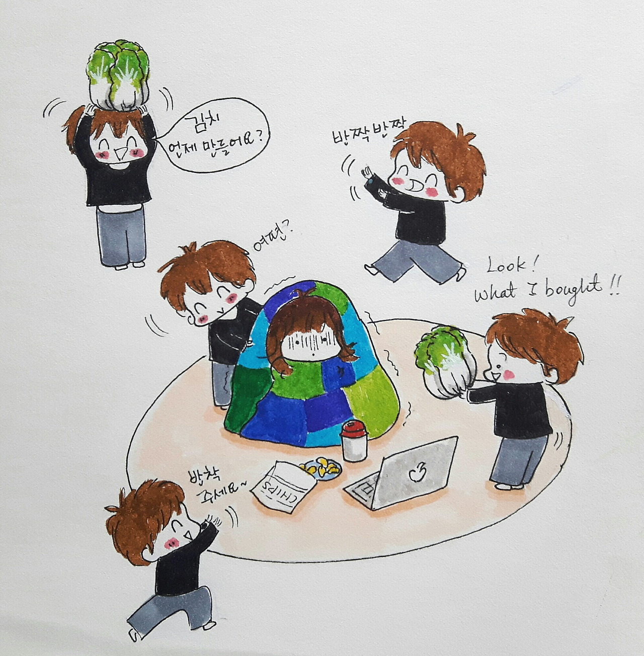 반찬통 비어가는데 빨리 뭔가 만들어야 되는거 아니냐, 반짝(남편은 반찬발음을 잘 못한다)이 없으면 마음이 넘 불안하다, 와이프 너무 게으르다고 엄마(울 엄마)한테 이를꺼다, 당장 한국 슈퍼에 시장조사를 가자 등등... 다 적을수도 없다.