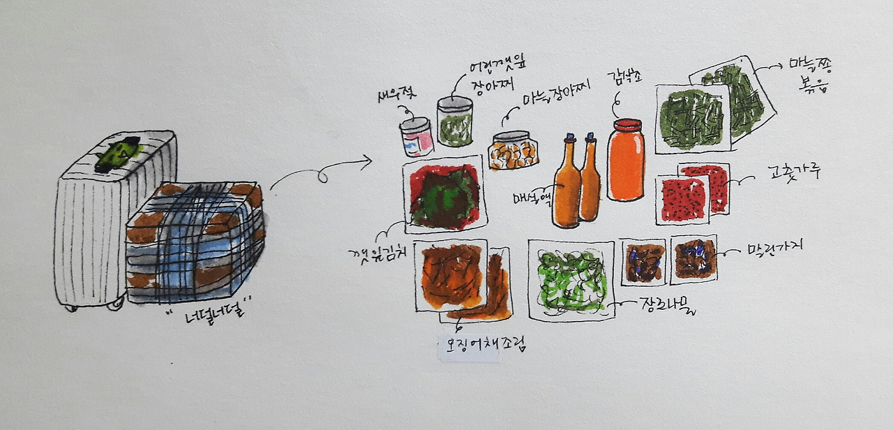 프랑스로 돌아오기 전날 엄마는 미니가 젤 좋아하는 오징어채랑 마늘쫑을 대량으로 조리고 정갈하게 담은 깻잎김치며 마늘 장아찌를 포장하느라 분주했다. 거기에 귀농한 막내삼촌은 손수 담은 매실액, 감식초, 말린 가지도 모자라 화개장터에서 공수해온 새우젓까지 챙겨주고, 허리아프신 외할머니께서 직접 말리신 나물이랑 고춧가루까지... 이미 책이며 마스크팩이며 몽땅 질렀기땜에 이 모든걸 다 가방에 넣으려니 역부족이었다. 결국 얘네들을 두개의 큰 가방과 하드보드 박스에 요리저리 나눠넣고 프랑스까지 이고지고 왔다.