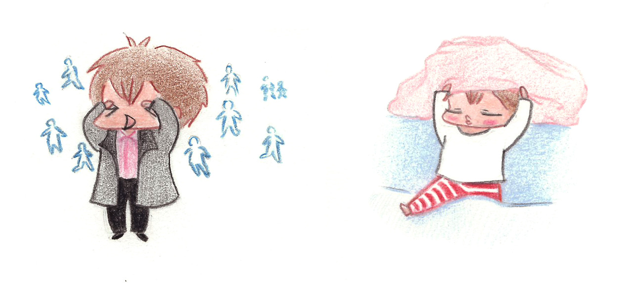 그 자신은 이것을 게으른 근육(lazy muscle)이라고 부르는데 근육이 피로하면 운동을 멈추어 버리는거다. 사람이 많은 곳, 움직이는 피사체가 많은 곳에 오래 있지 못하는 것도 그 이유다. 누워서 책을 읽거나 잠을 자거나 할 때에는 무조건 담요 또는 손에 잡히는 무언가를 이마에 올리는 습관이 있는데 남편의 어릴 적 앨범을 보니 아주 자그마한 아이일 때부터 이미 그래왔다는 걸 알게 되었다.