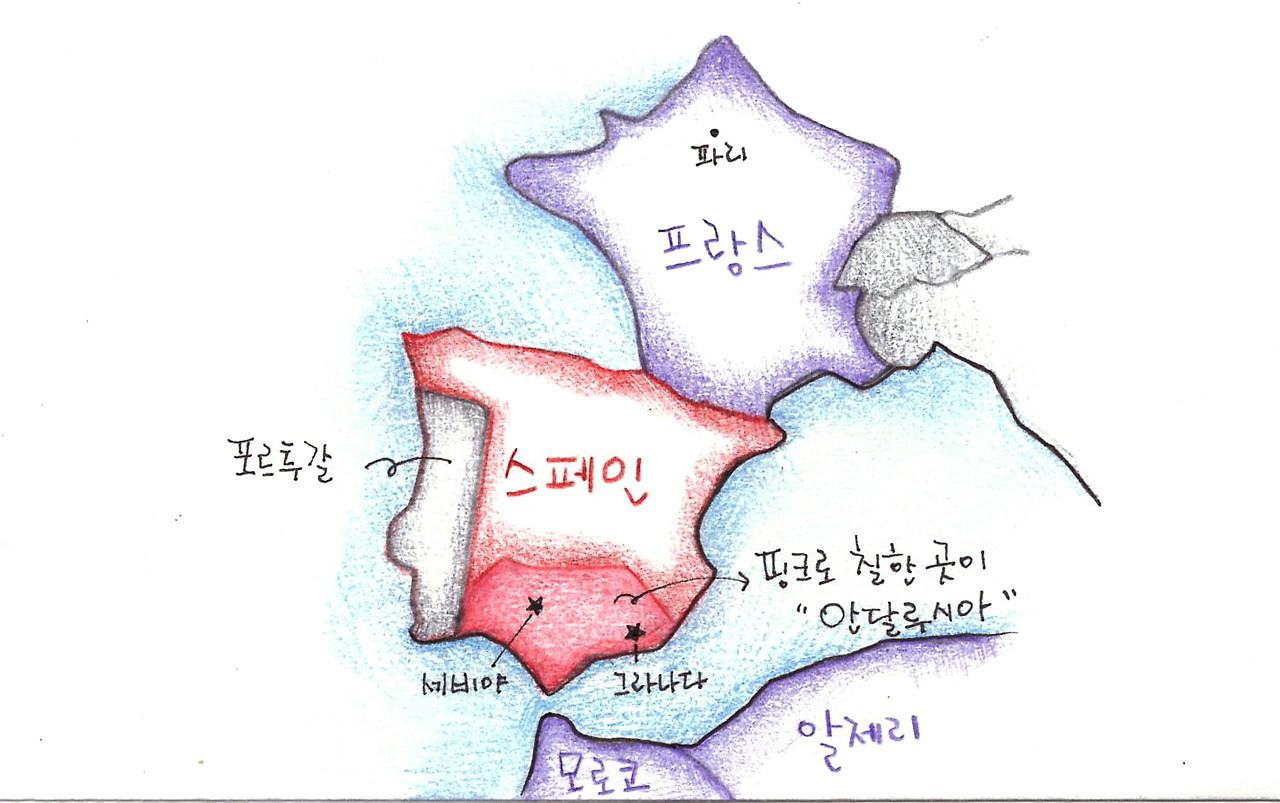 혹시나 궁금해 하실 분들을 위해 한 번 그려보자면 이 정도가 될 거 같다. 저 아래 색칠한 부분이 바로 안달루시아 지방인데 바다를 사이에 두고 아프리카 대륙의 모로코, 알제리와 매우 근접해 있다. 이러한 지형적 이유에 역사적인 부분이 더해져서 안달루시아 지방은 아랍과 유럽의 문화적 산물이 공존하는 오묘한 곳이라고 들었다.