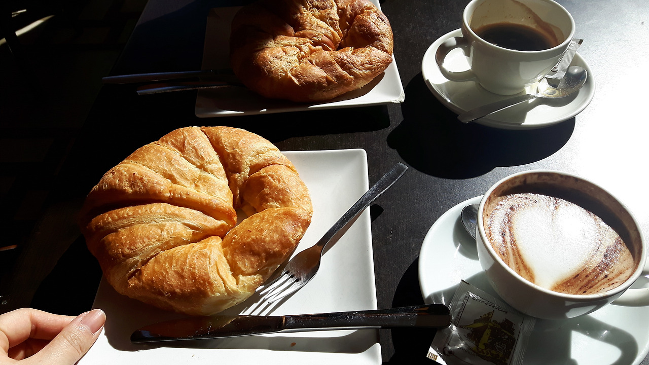 본래 우리가 가려 했던 브런치 레스토랑은 호텔에서 꽤나 먼 거리였지만 상쾌한 아침 공기도 뺨을 스치고 따사로운 햇살도 간질간질, 기분이 좋으니 좀 걷는게 무슨 대수인가? 오늘도 지도 없이 좁은 골목길을 돌고 돌아 찾아갔건만 웬일인지 셔터는 내려져 있었다. 시계를 보니 10시가 넘었다. 인터넷에 분명 9시에 오픈한다고 쓰여 있었고 지금 보니 식당 문 앞에도 떡 하니 적혀 있는데? 안쪽에서는 청소를 하는 건지 쿵쾅쿵쾅 둔탁한 잡음이며 사람들의 이야기 소리가 들려왔지만 셔터가 내려져 있으니 언제 영업을 시작하는지 물어볼 수도 없었다. 어쩔 수 없이 오는 길에 본 현지인들이 꽉 들어차 있는 목이 좋은 카페에 자리를 잡았다. 각자 크로아상과 커피를 주문하고 매우 허기가 진 상태였으므로 나눠먹을 토스트도 하나 주문했다. 그리고는 이런저런 수다를 떠는 와중에 이 한 접시의 대왕크로아상이 나온 거다.