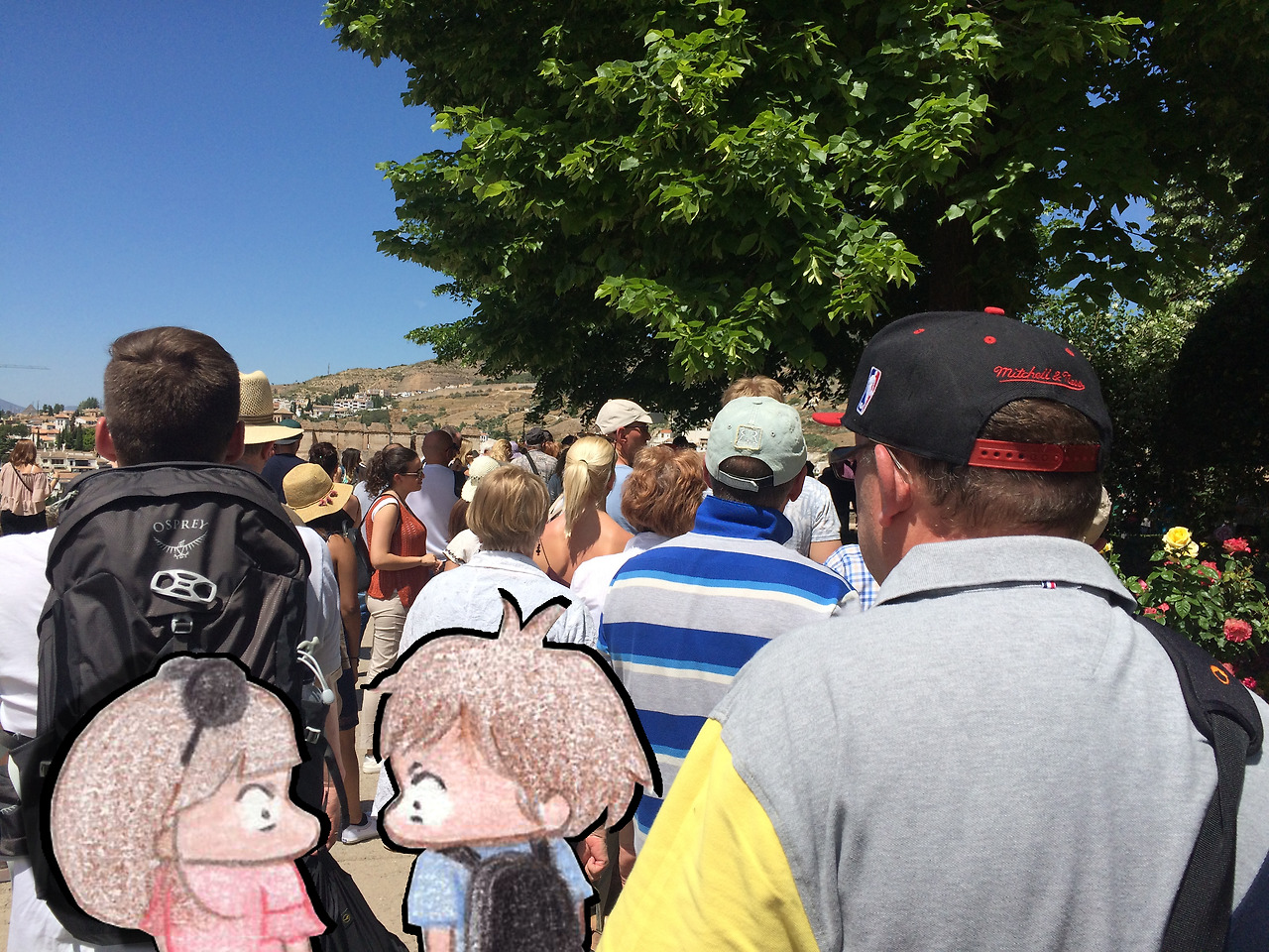 알람브라까지는 걸어서도 갈 수 있었지만 급경사진 오르막 길을 꽤 오래 걸어야 하고, 이 날은 햇빛도 너무 뜨거워서 버스를 탔다. 매년 3백만 명이 찾는 명소라는게 관광객으로 꽉 찬 버스를 보니 실감이 난다. 화장을 곱게 하고 커다란 링 귀걸이를 한 버스기사님은 온화한 미소와 달리 운전 스타일이 어찌나 터프하신지 돌 길을 질주하는 버스에서 서 있는 일이란 생각보다 훨씬 어려웠다.