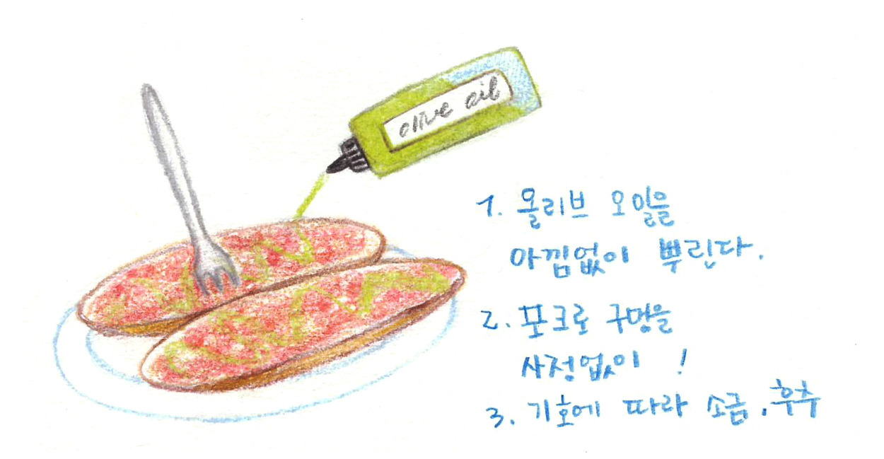 올리브 오일을 거침없이 뿌린 토스트를 포크로 사정없이 콕콕콕 찍어서 빵이 그 구멍들을 통해 오일을 쫘악 흡수하도록 해 주는 것.