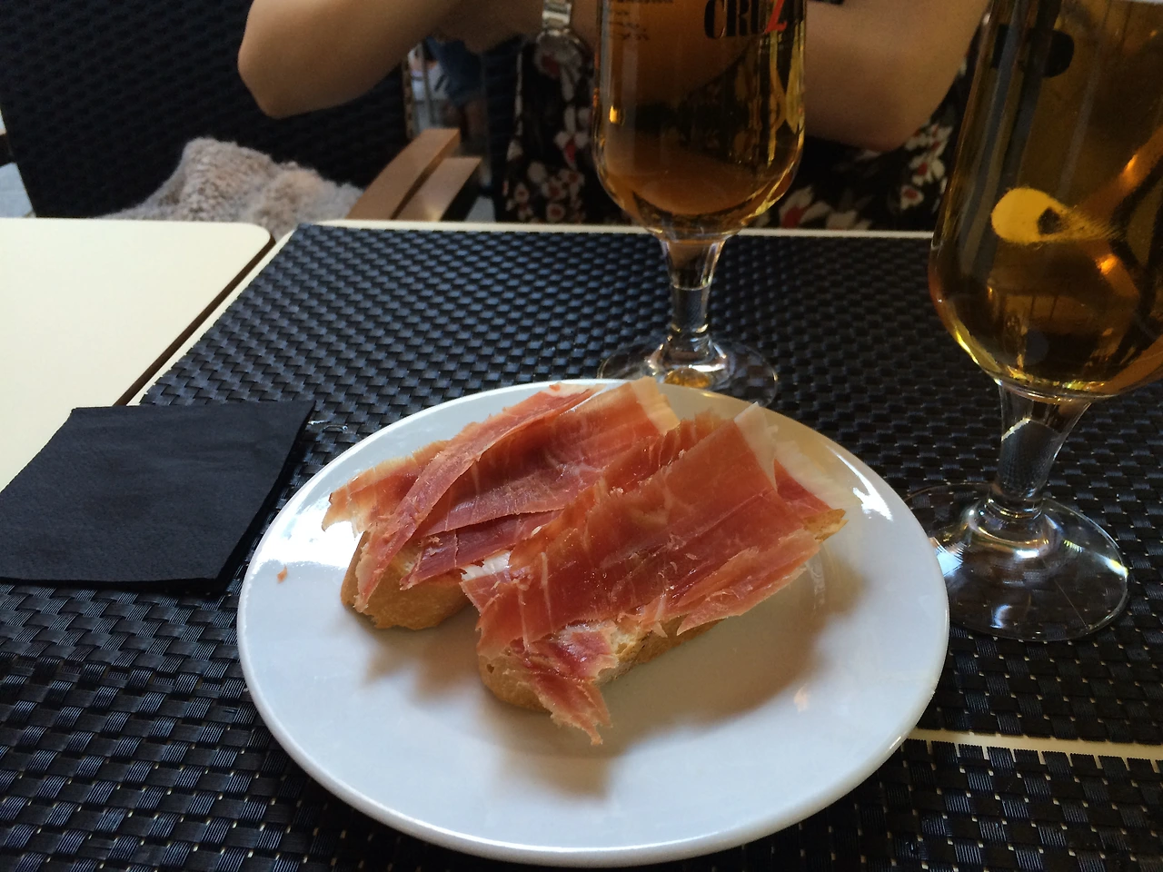 기쁘게 호텔로 돌아가 샤워를 하고 근처광장으로 나왔다. 고생한 몸뚱이에 수분을 채워주기 위해 맥주를 한 잔씩 주문하니 이베리아 포크로 만든 하몽을 얹은 바게뜨가 나왔다. 이것이 바로 그라나다의 아름다운 문화, 술이나 탄산을 한 잔 주문하면 작은 타파스가 무료로 제공된다. 맥주도 맛있고 하몽도 너무 맛있어서 메뉴판을 부여잡고 동공 굴리기를 한참 한 뒤에 문어랑 크로켓도 주문했다. 물론 맥주도 더 마시고. 나는 원래 해산물을 좋아하니 내 평생 이리 부드러운 문어는 처음이라며 감탄을 하면서 먹었고, 예전엔 징그럽다고 손도 안대던 미니도 문어의 참 맛을 알게 되서 더더욱 기쁜 날. 맛있는 것을 함께 나눠 먹을 사람이랑 산다는 것은 얼마나 축복인가. 근데 미니가 너무 잘 먹어서 은근 경쟁심이 불탔던 것은 나만 알기로.