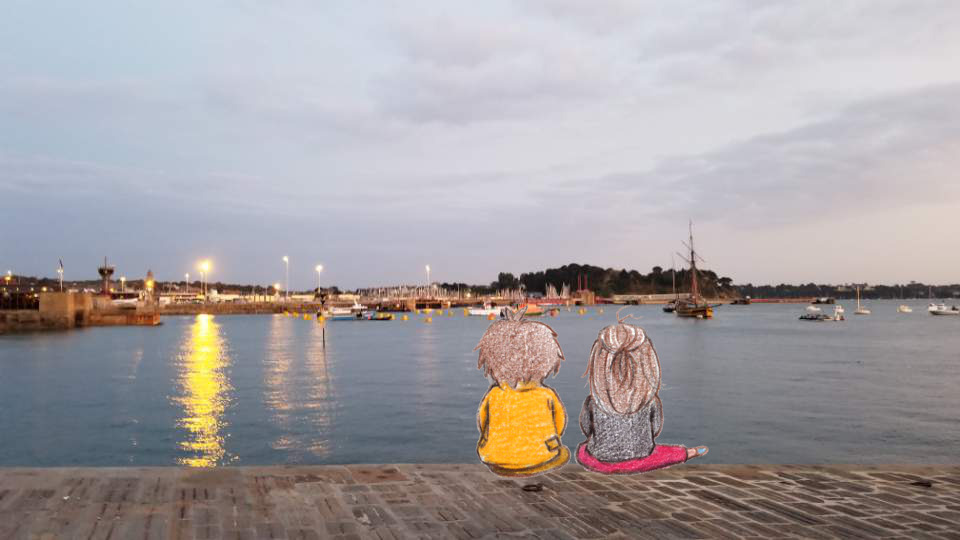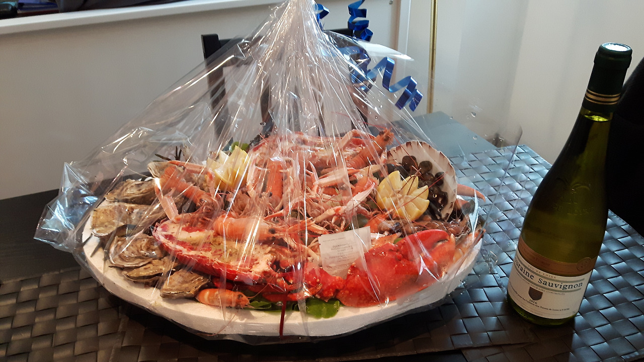 라고 말하는데 너무 웃겼다. 해산물이 산처럼 쌓인 플라또(plateau: 쟁반에 담긴 음식)를 들고 나타난 미니. 본인도 이렇게 투명하게 포장을 해 줄 거라곤 예상을 못했단다. 그 북적북적한 작은 마을에서 관광객 물결을 가로지르며 해산물 동산을 들고 땀 흘리며 왔을 내 남편. 양 손엔 이 무거운 걸 들고 백팩에는 물이랑 시원하게 칠링 된 화이트 와인과 시드르를 담아 왔다.
