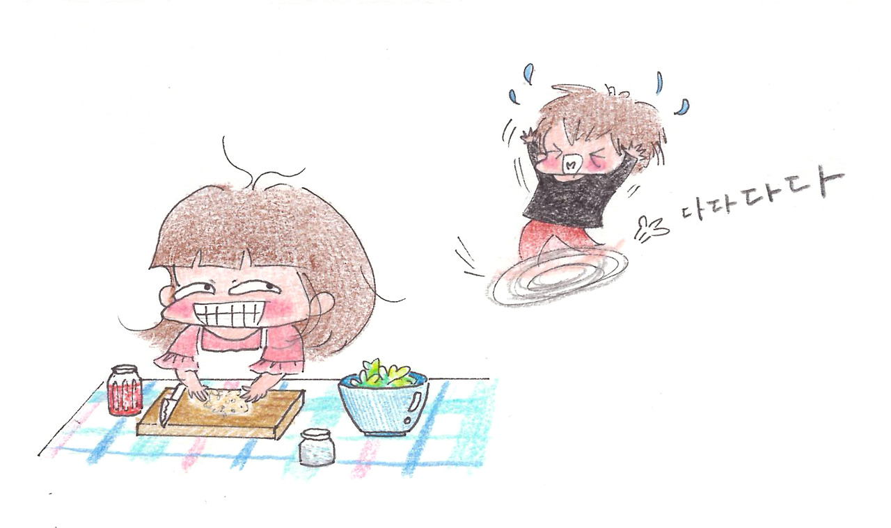 우연인지 필연이지 마늘이 다 떨어져 가던 무렵에 한국행 티켓을 샀는데 그게 벌써 3개월 전. ( =마늘장아찌를 못 먹은 지 3개월) 백수인 나는 한국에 좀 오래 있을 예정이라 미니보다 2주 먼저 떠나고 열흘 늦게 프랑스에 온다. 한국에 갈 날이 확정되고 엄마랑 통화를 하던 날, «마늘 많이 담아놨어»라는 엄마의 말을 전해 듣고 조~용해진 미니. 눈만 꿈뻑꿈뻑 무언가 생각하는 듯하더니 입을 열었다.