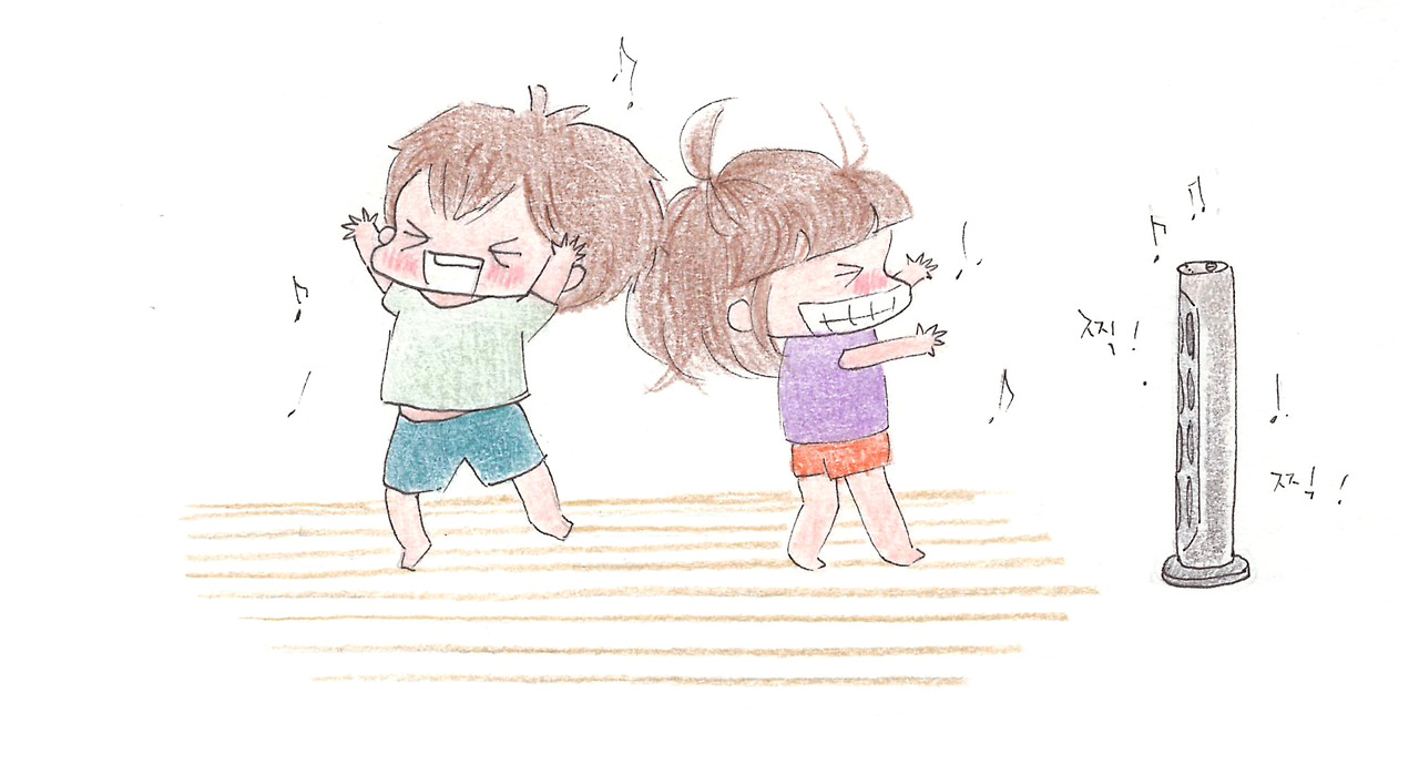 물을 뚝뚝 흘리며 헐레벌떡 나온 남편을 선풍기 앞에 앉혔지요. 의심 많은 미니는 몇 번이나 소리의 근원을 확인하고는 그제야 안심을 하는 눈치였어요.