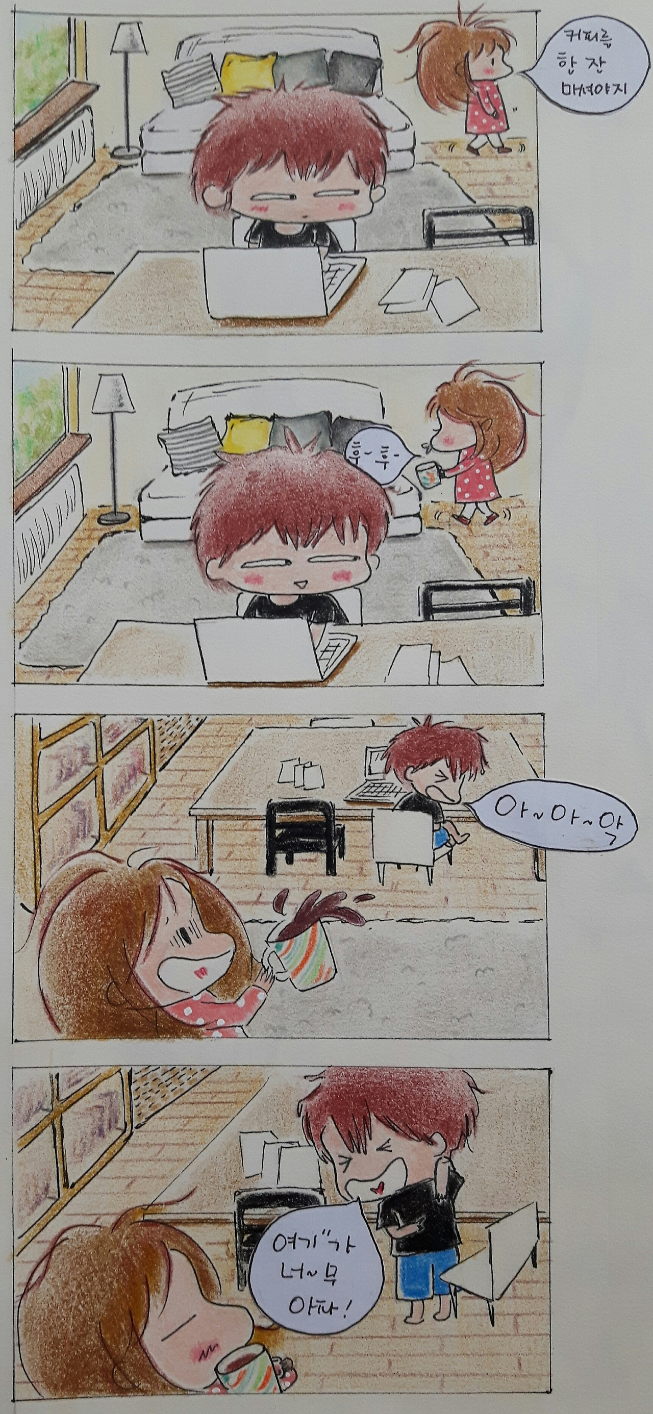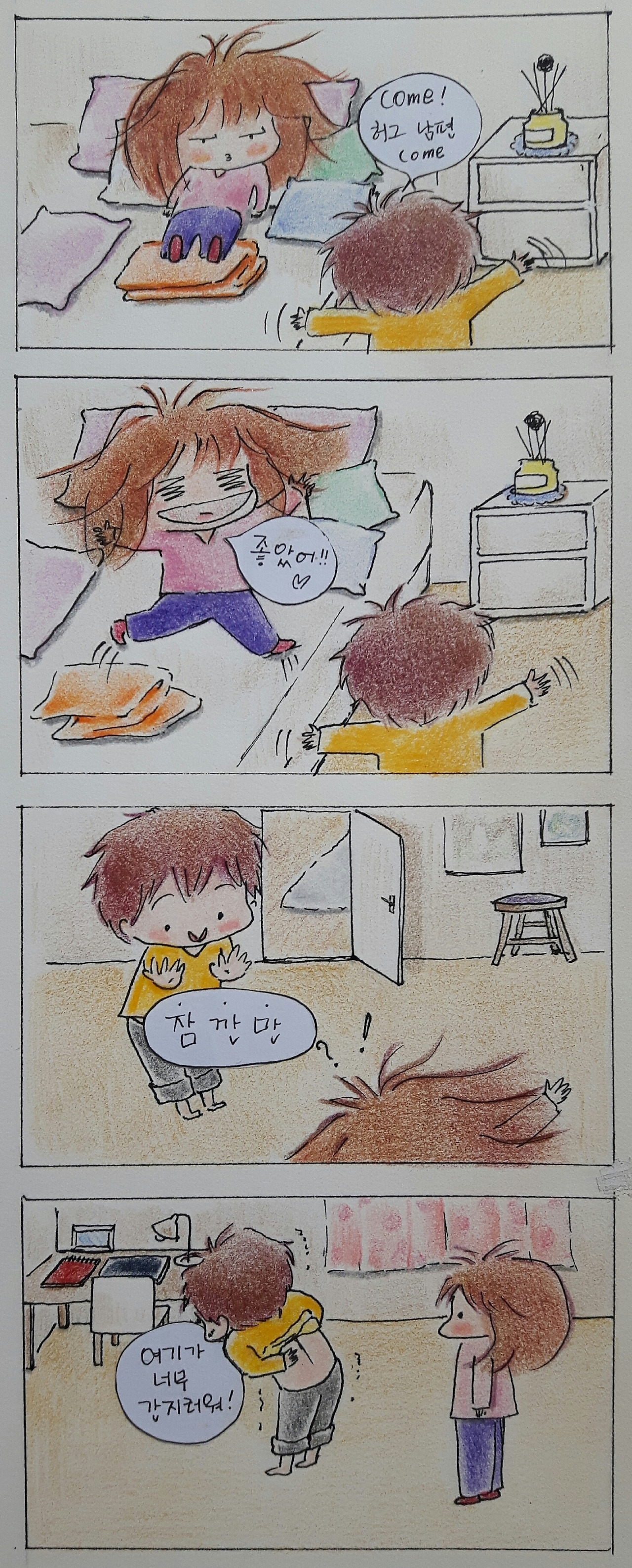 첨엔 너무 어이가 없어서 깔깔 웃었는데 잠들기 전에 침대에 누워서까지도 "내 발명에 대해 어떻게 생각해? 혼자 등긁는게 쉬운건 아니잖아?" 라고 묻는걸 보니 갑자기 웃음이 쏙 들어가 버렸다. 등 좀 긁어주는게 뭐라고 내 남편이 이런 생각까지 하게 만들었나 싶은 생각에 짠해졌기 때문인데 얼마나 갈진 모르겠지만 그 후로 나는 다시 그의 등을 열심히 긁어준다. 그리고 남편에게서도 전과 달라진게 하나 있다면...