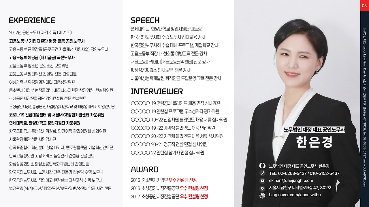 또한 연매출 120억 미만의 중소기업이라면 100,000원~315,000원의 비용으로 노무사의 컨설팅을 받아볼 수 있다. 한은경 노무사는 중소기업청, 소상공인시장진흥공단의 전문 컨설턴트로서 2년 연속 우수 컨설팅 사례로 선정된 바 있다. 비용부담없이 종합적인 인사노무 컨설팅과 노동부 지원금까지 모두 컨설팅 받고 싶다면 언제든지 아래 번호로 연락주기를 바란다...!!